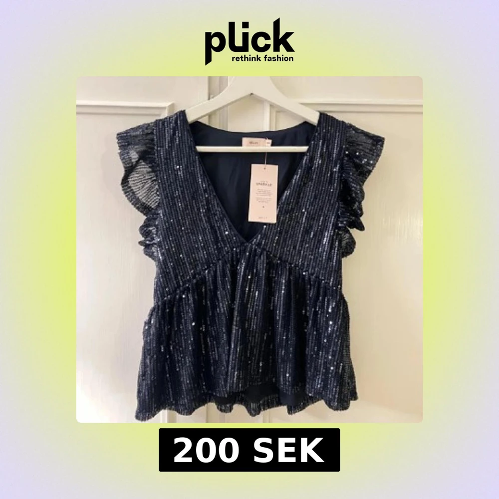 Topp från Nelly med glittriga paljetter, v-ringning och volangiga ärmlösa axlar. Köpte helt ny på plick andvänd ändas EN gång! jätte bra sick skriv för fler bilder rätt i storlek!💞sitter som xxs och xs!