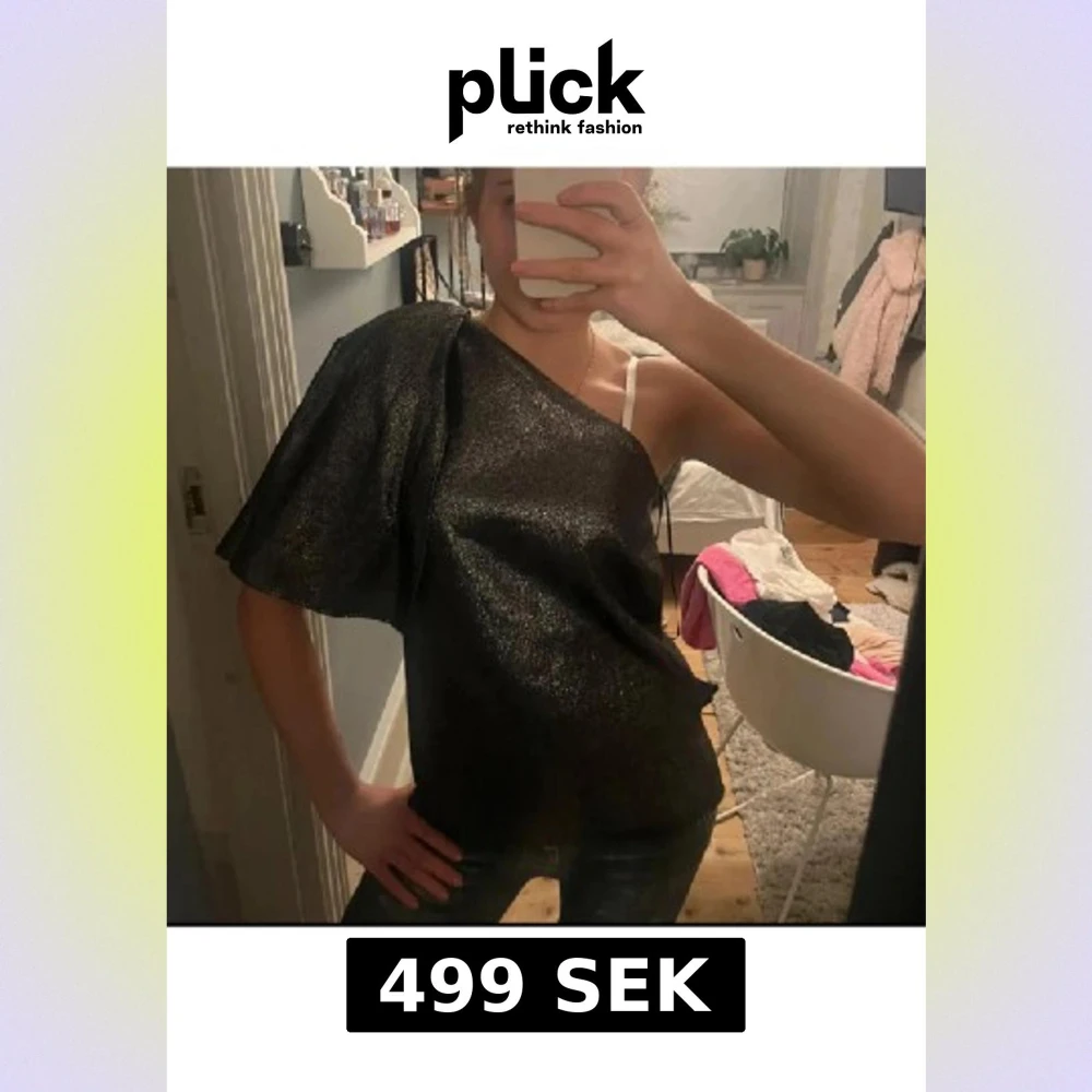 INTRESSEKOLL❣️ skitsnygg och perfekt till nyår! Strl XS passar också S. Endast använd 1 gång! Säljer en glittrig oneshoulder topp i mörkgrå färg med en stor, luftig ärm på ena sidan och axelbandslös på andra. Materialet har en skimrande finish som ger en festlig vibe. Perfekt för dig som vill sticka ut med en cool och trendig look.