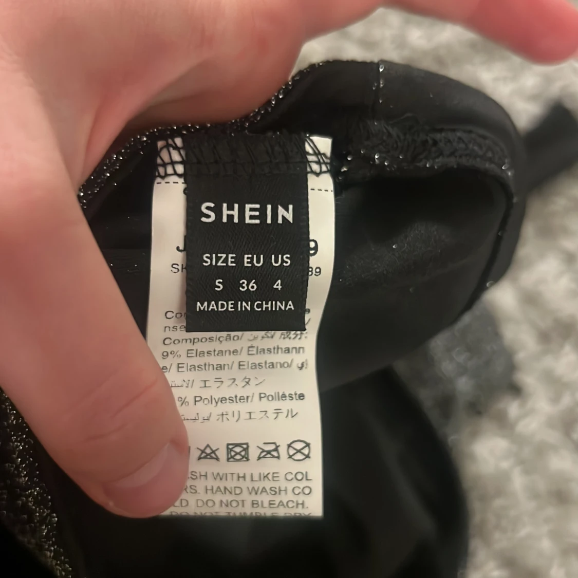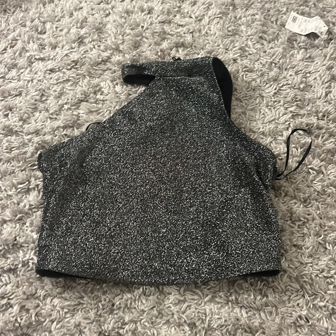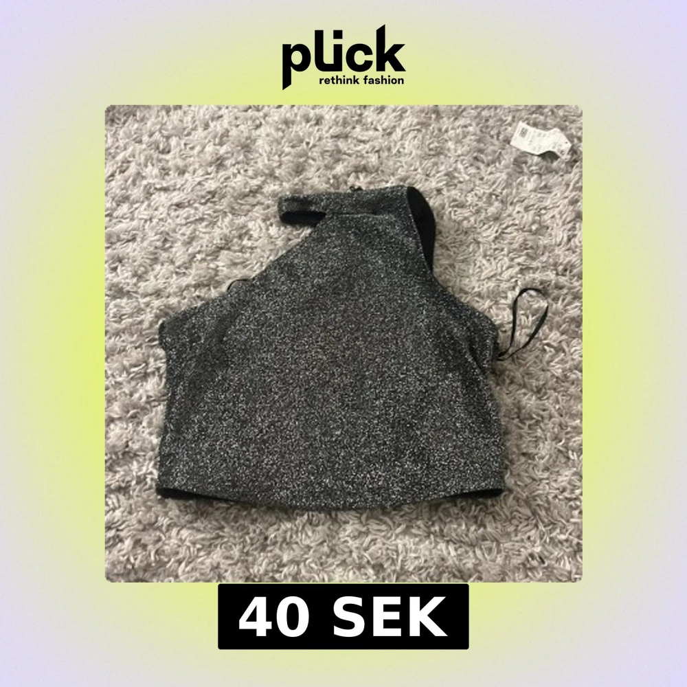 Säljer en glittrig silverfärgad oneshoulder topp från SHEIN. Toppen har en croppad passform och är perfekt för dig som vill sticka ut. Materialet är syntet och toppen har en snygg asymmetrisk design.