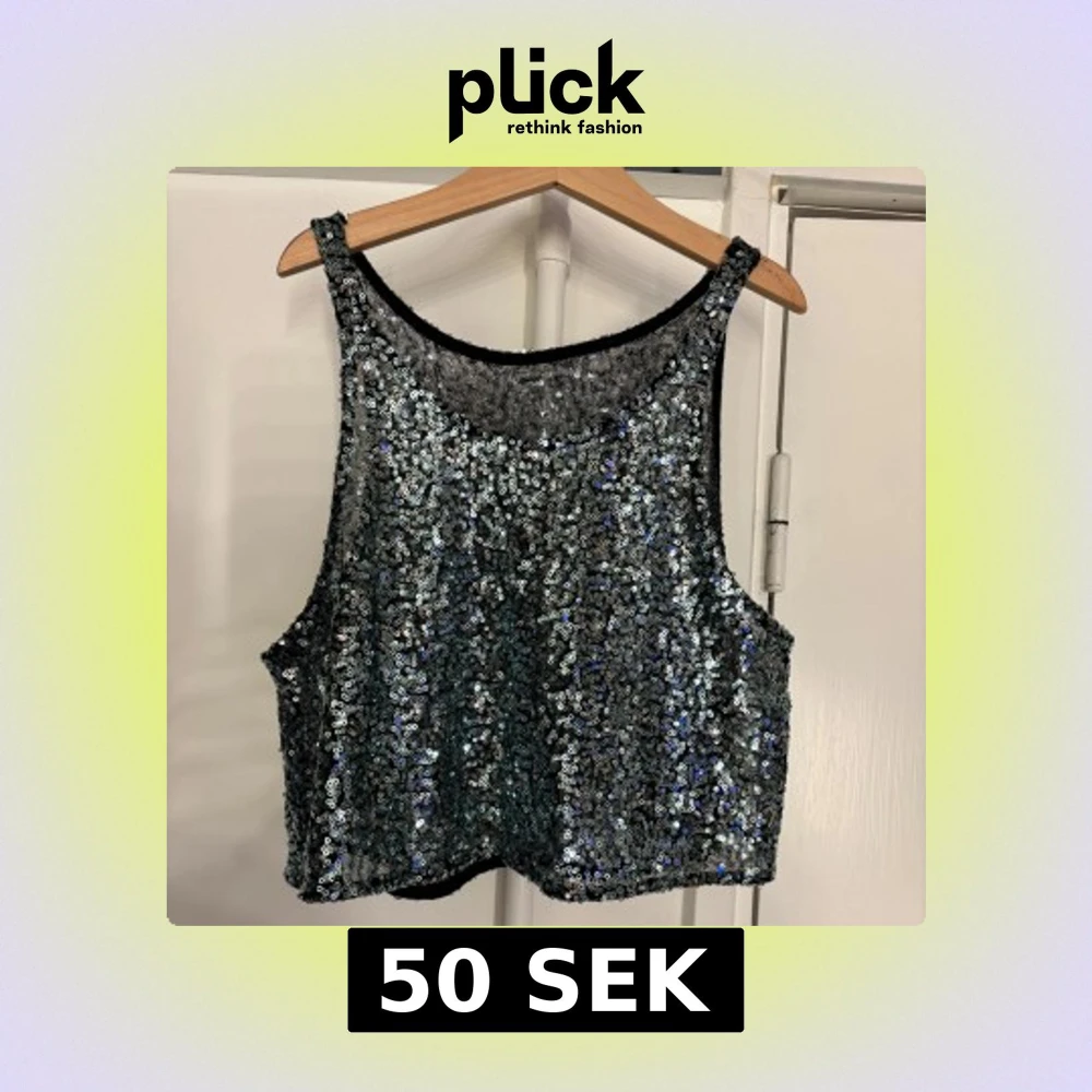 Snygg glittrig paljettopp i silver med ärmlös design. Perfekt för en festlig kväll. Toppen har en croppad passform och är täckt av glittrande paljetter som fångar ljuset.