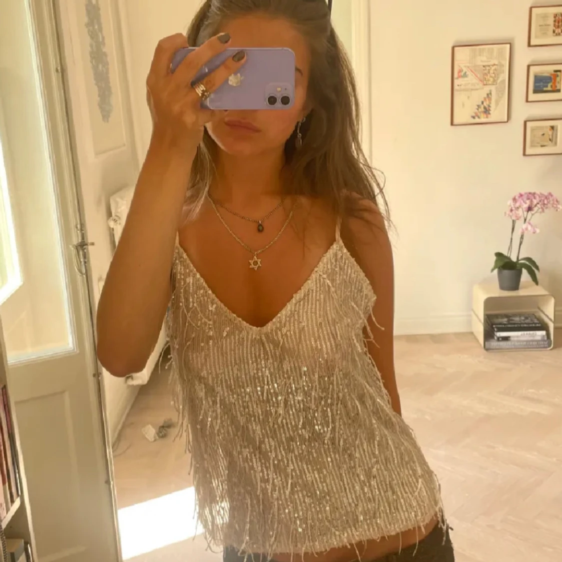 Säljer en glittrig topp med tunna axelband och v-ringning. Toppen är täckt av silvriga paljetter och fransar som ger en riktigt festlig känsla. Mycket bra skick!!💞