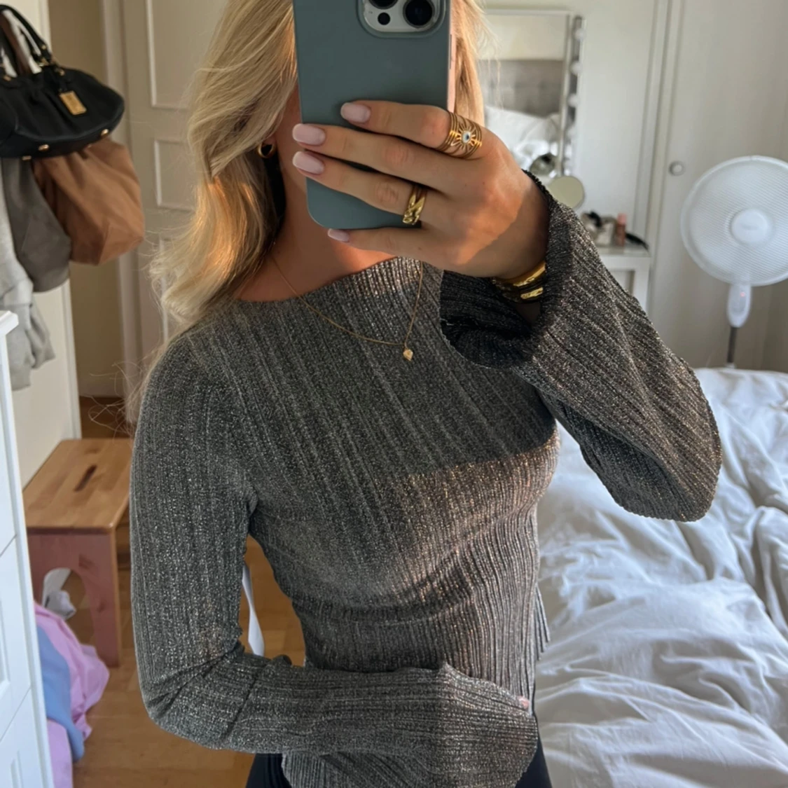 Supersnygg glittrig ribbad topp, perfekt till fest!💖 Tröjan har en figurnära passform och lätt utsvängda ärmar. Nytt skick med prislapp kvar