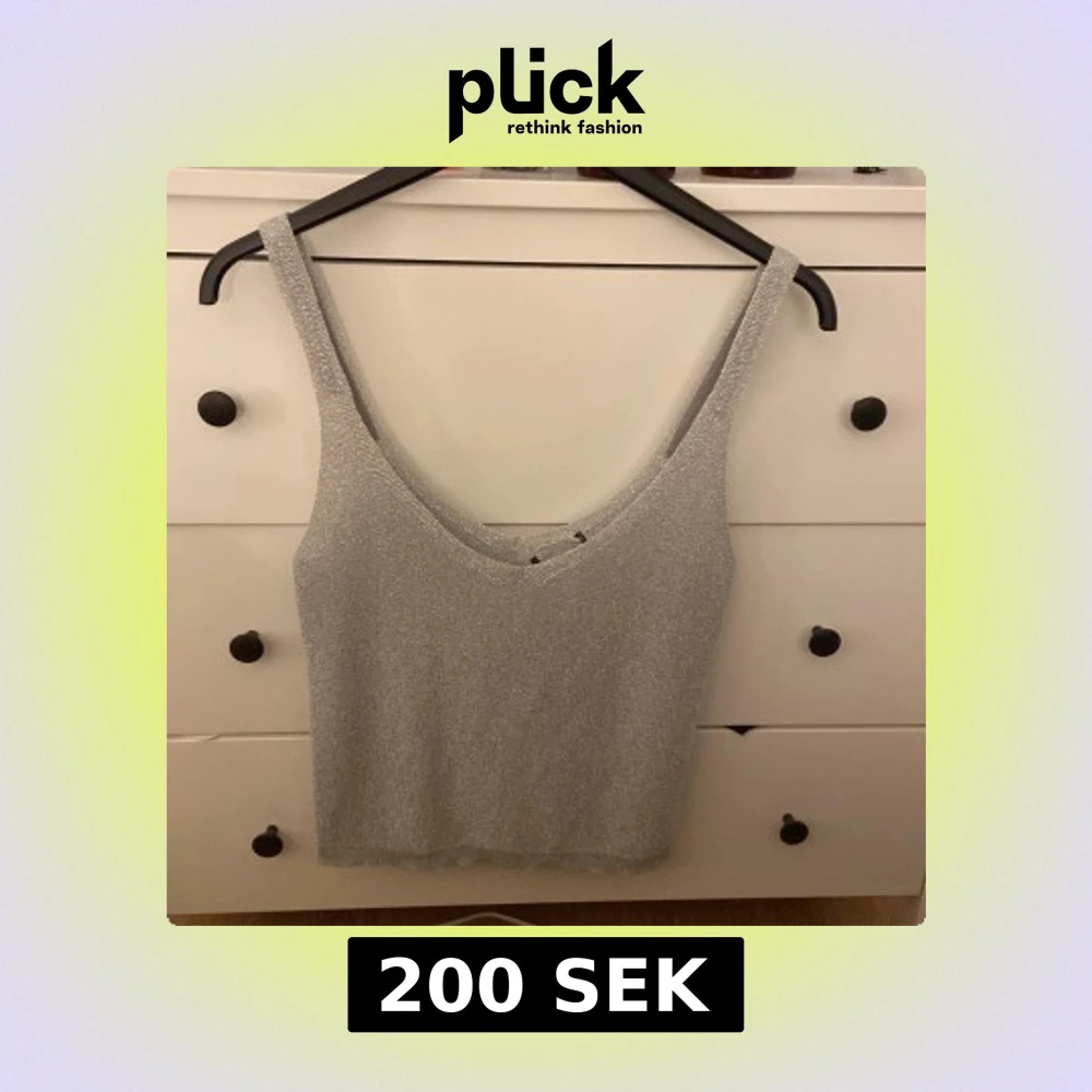 Säljer en glittrig silverfärgad linnetopp med djup v-ringning och smala axelband. Perfekt för dig som vill sticka ut med en snygg och trendig topp. Materialet är mjukt och skimrande, vilket ger en cool look.