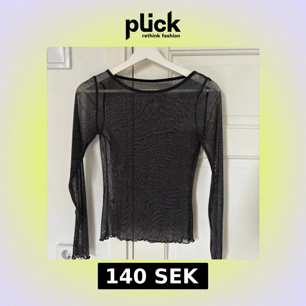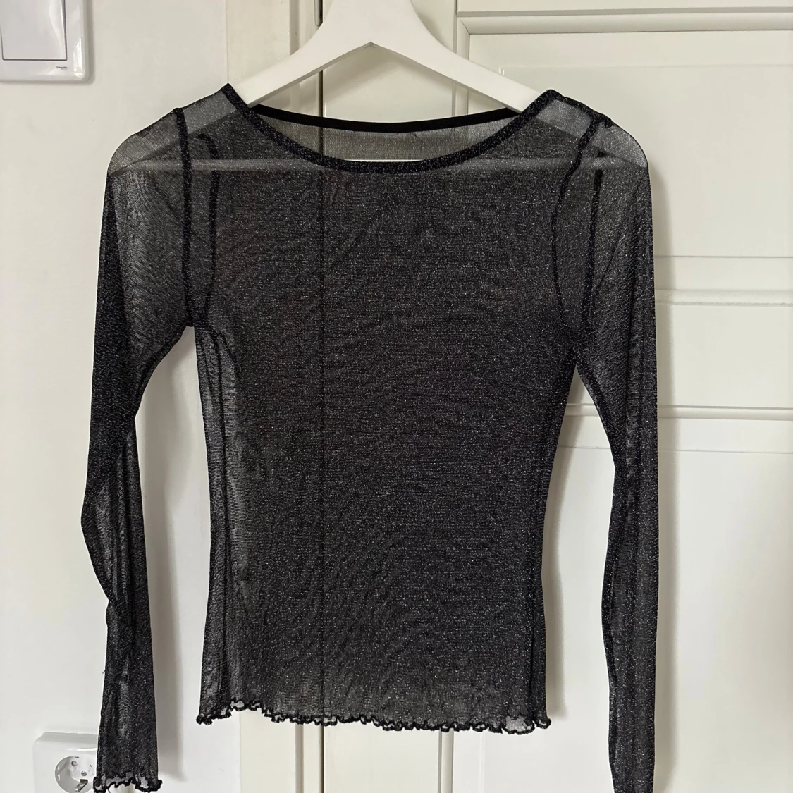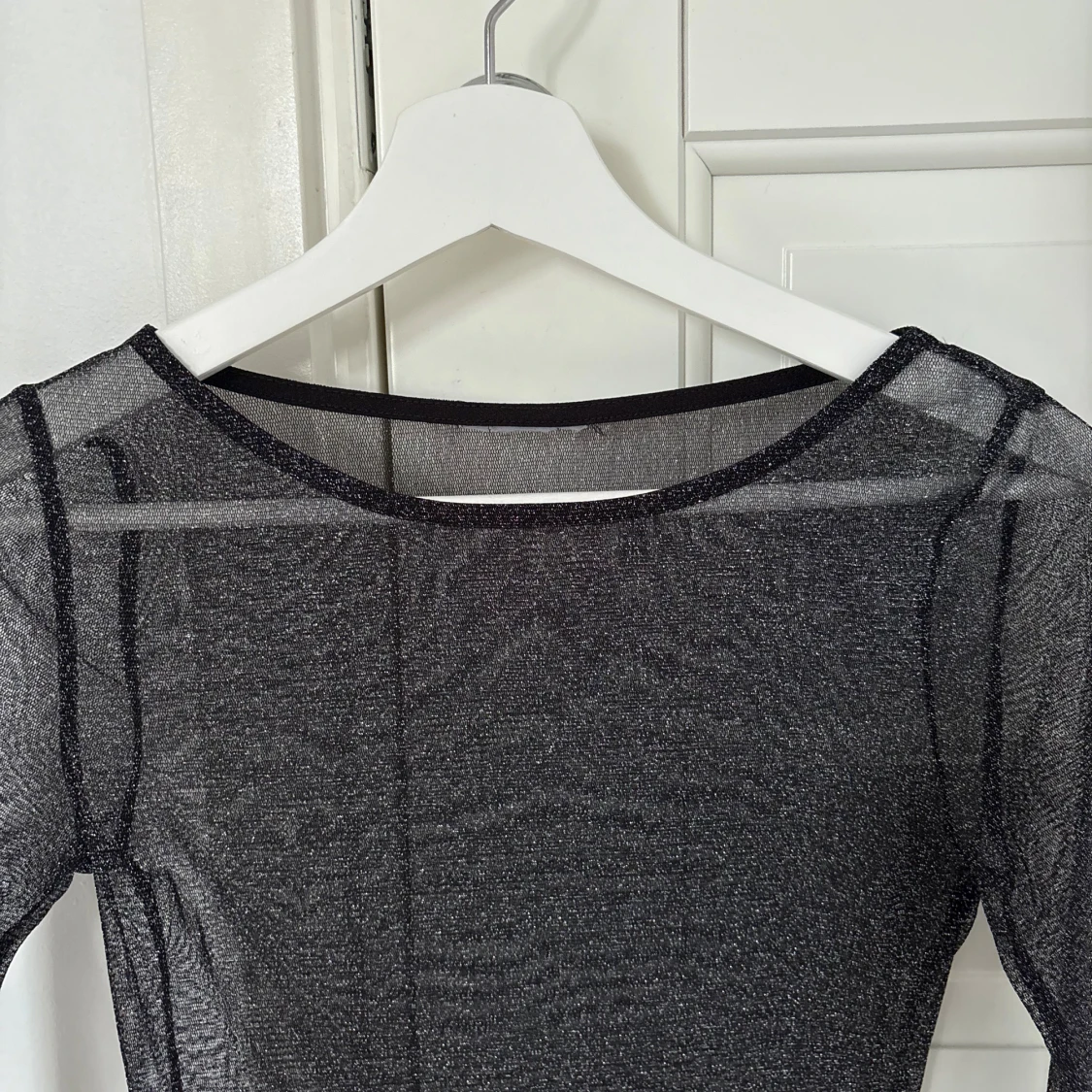 Säljer en transparent svart mesh topp med glittrigt tyg och långa ärmar.