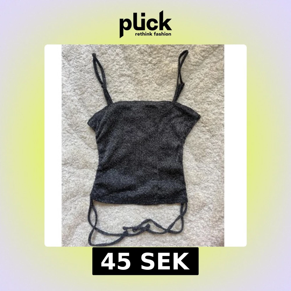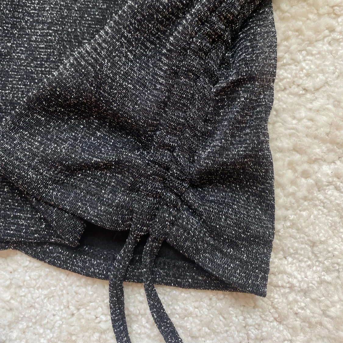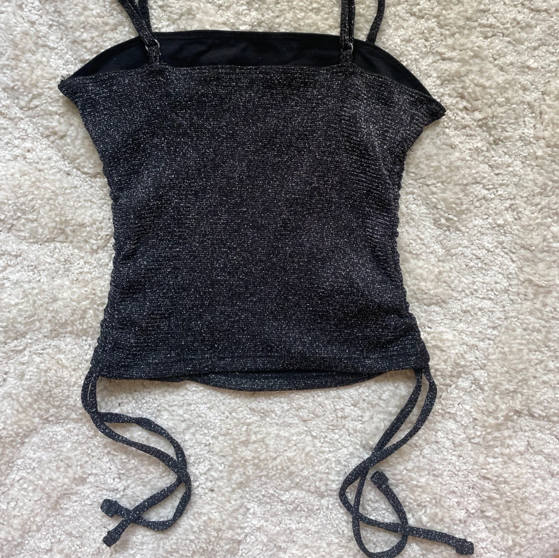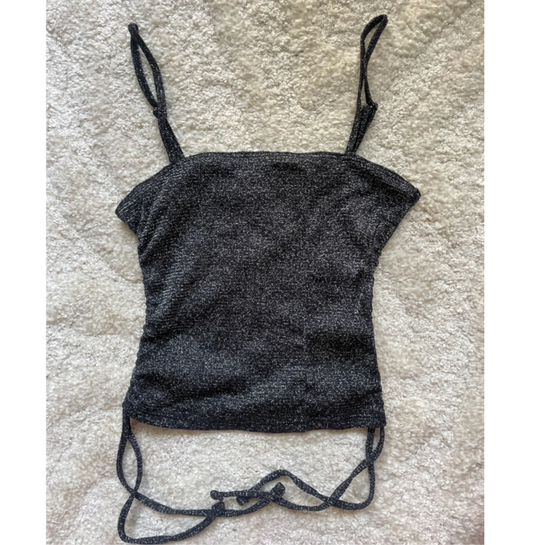 Supersnygg svart linnetopp från Hollister i storlek S med glitter. Toppen har smala axelband och snörning i sidorna för att justera längden. Materialet är mjukt och stretchigt, perfekt för att ge en cool vibe till din outfit.