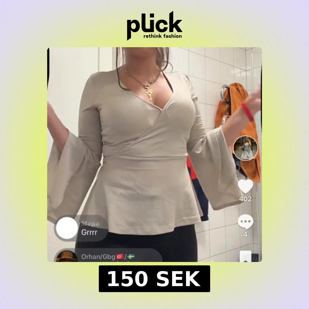 Väldigt snygg top från Bubbleroom, champagne färgad och glittring. Toppen har En V krage men går o lösa med säkerhetsnål. Finns en knyt man knyter bakom för och göra blusen mer tajt, har utsvängda armar. Har inga defekter som jag själv har märkt.