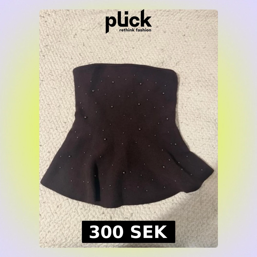 Säljer en brun stickad tubtopp dekorerad med små pärlor över hela plagget. Toppen har en lätt utsvängd form nedtill och är perfekt för att skapa en trendig look. Superfin att styla med både jeans och kjol!