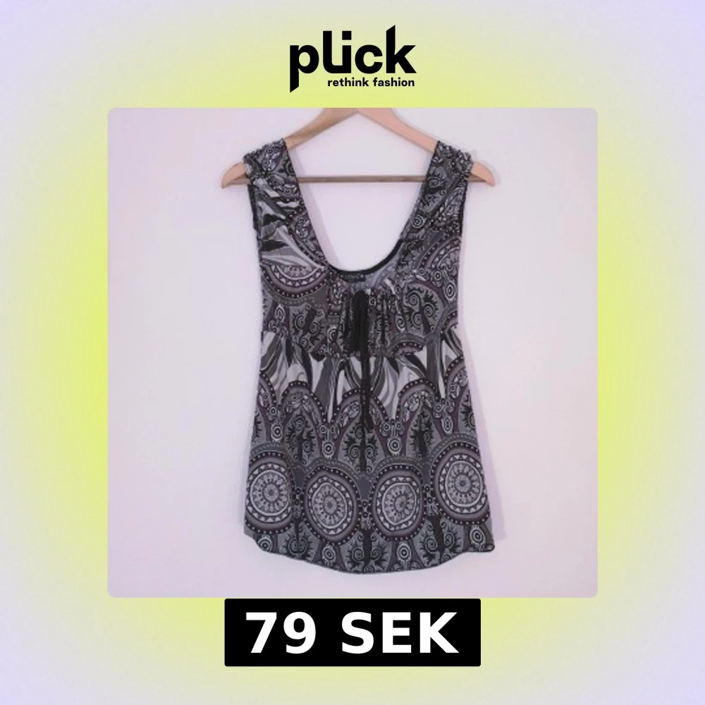 Topp från Lucky's Paris i vackert mönster i vitt, grått och mörklila, djup urringning både fram och bak. Det står ingen storlek men den är väldigt elastisk runt armar och runt bysten, så jag estimerar att den nog passar flera olika storlekar ca M till L. Men kan mäta och ta fler bilder vid intresse!