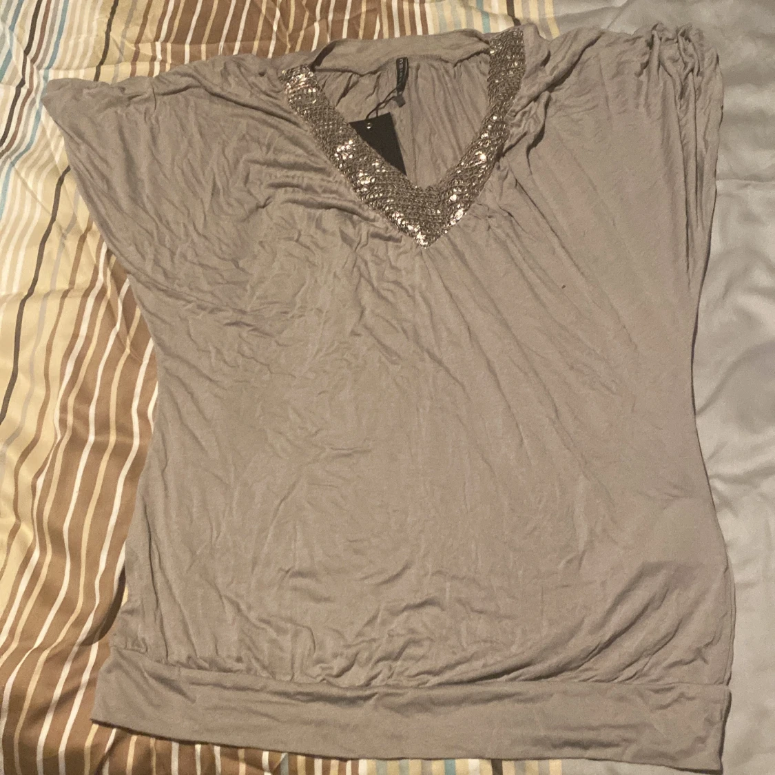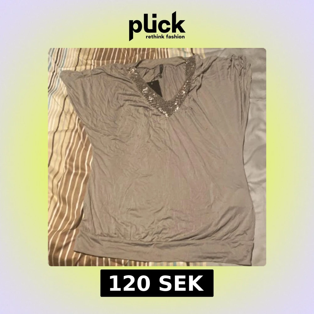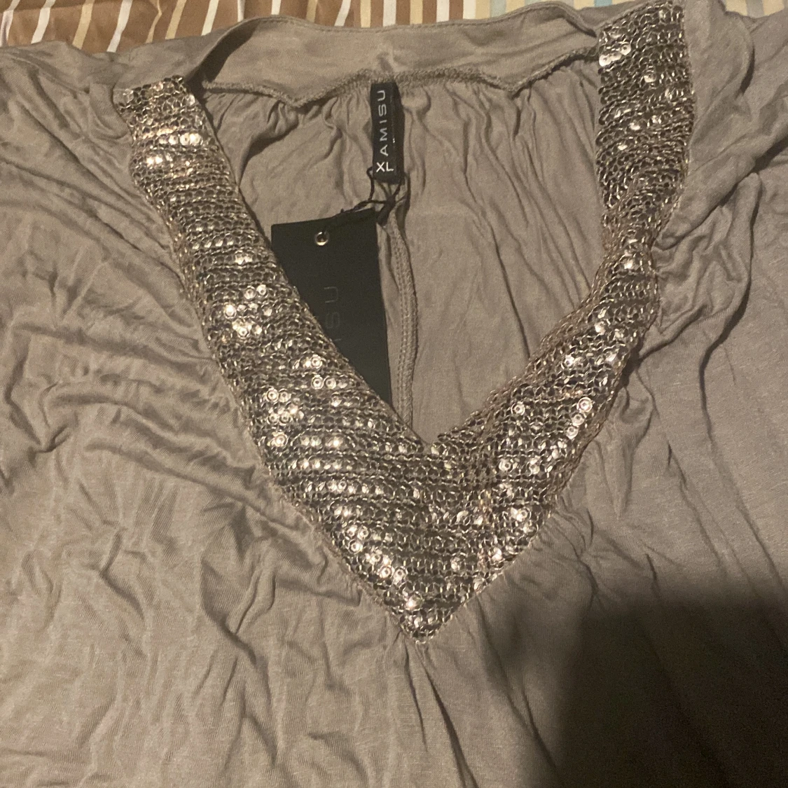 Snygg grå topp från Amisu i lös passform med korta ärmar. V-ringad hals med bred kant täckt av silvriga paljetter som ger extra bling. Mjuk och skön i bomullsmix, perfekt när du vill sticka ut lite extra. Enkel att matcha med både jeans och kjol.