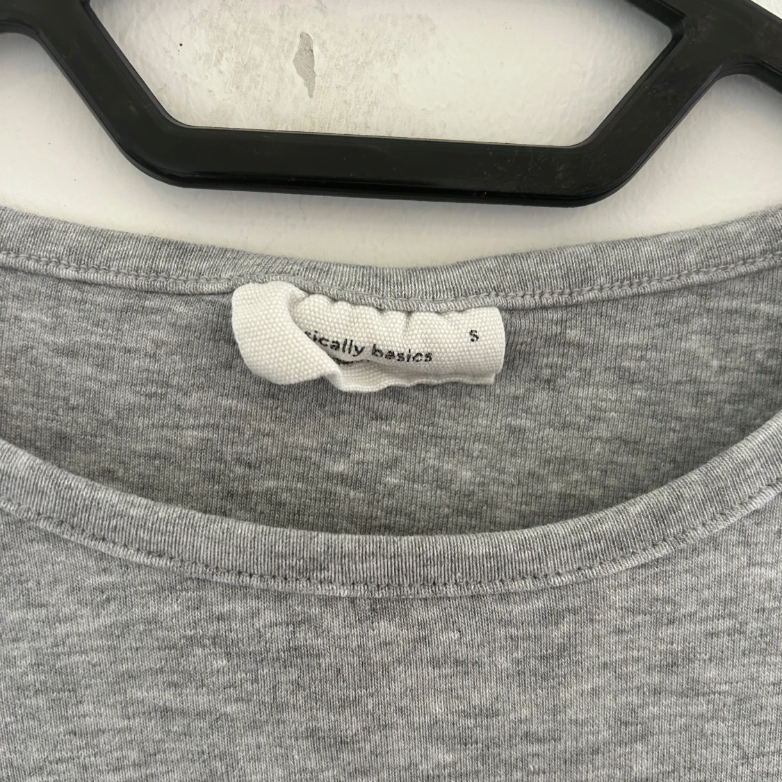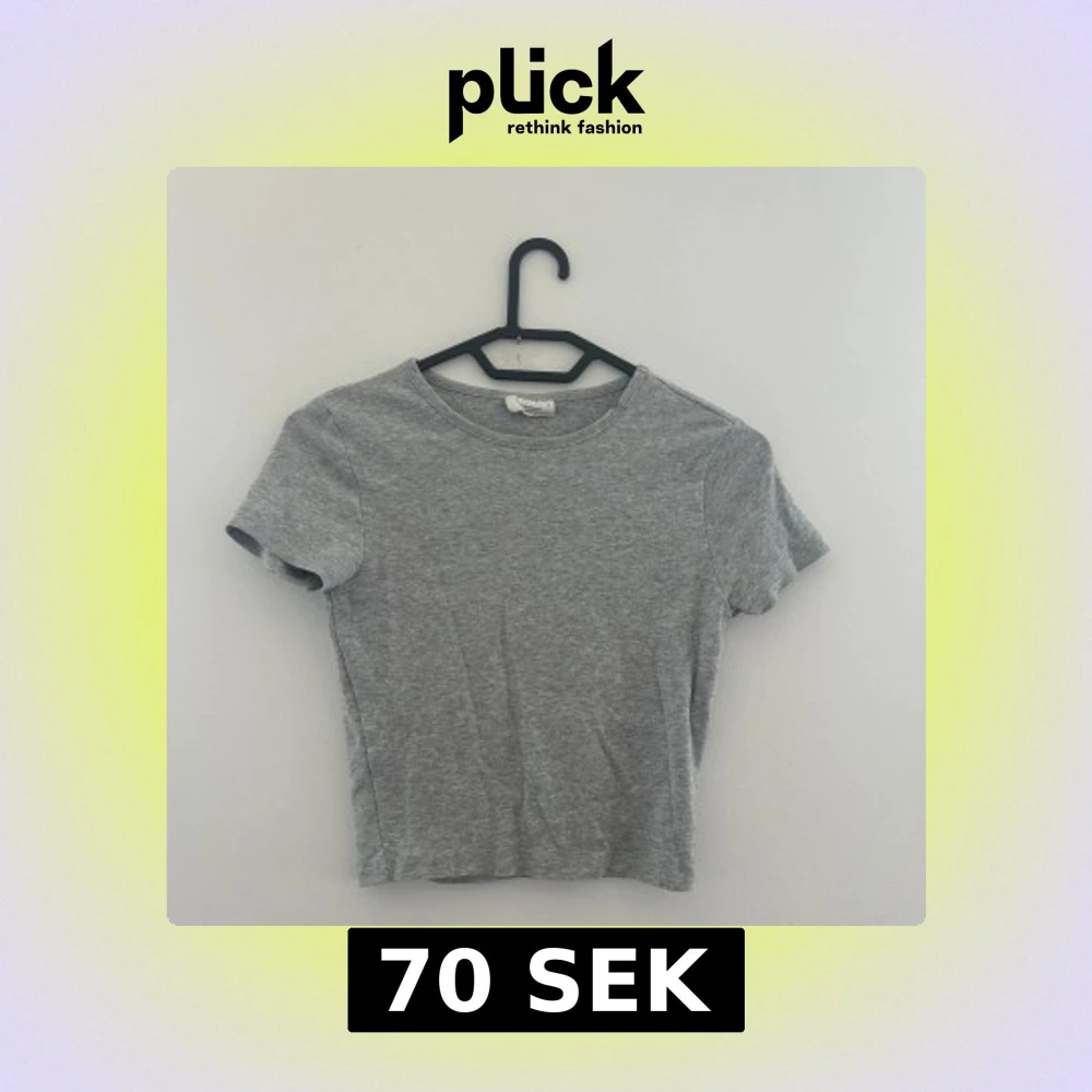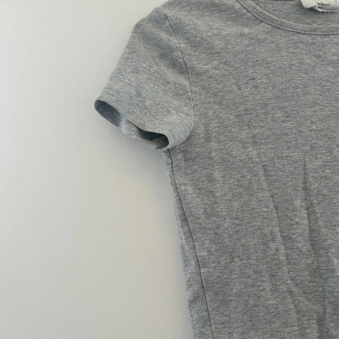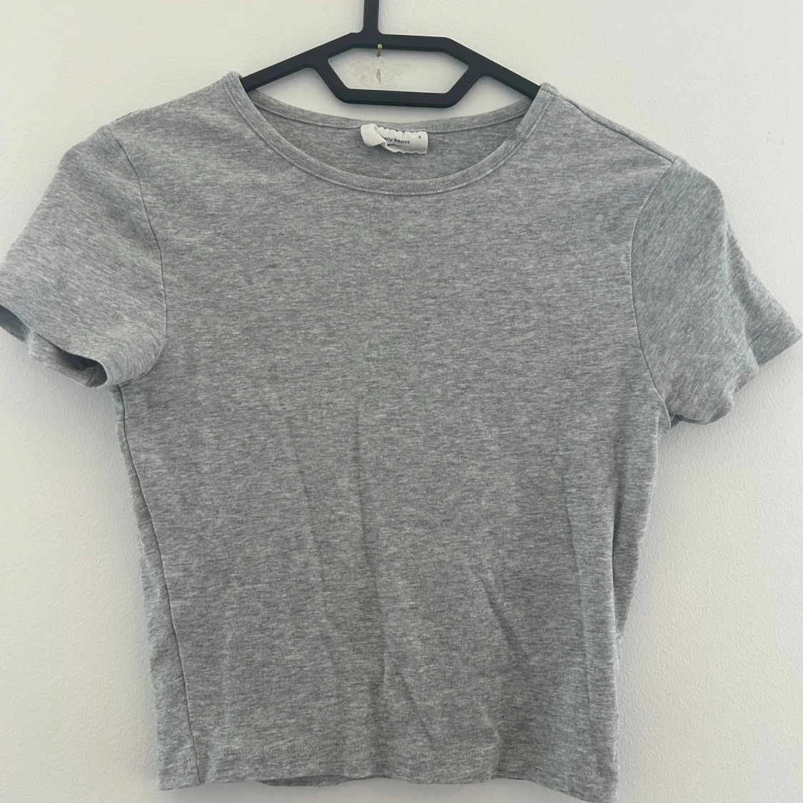 Enkel och stilren grå croppad topp från Gina Tricot Basics. T-shirten har rund halsringning och korta ärmar.