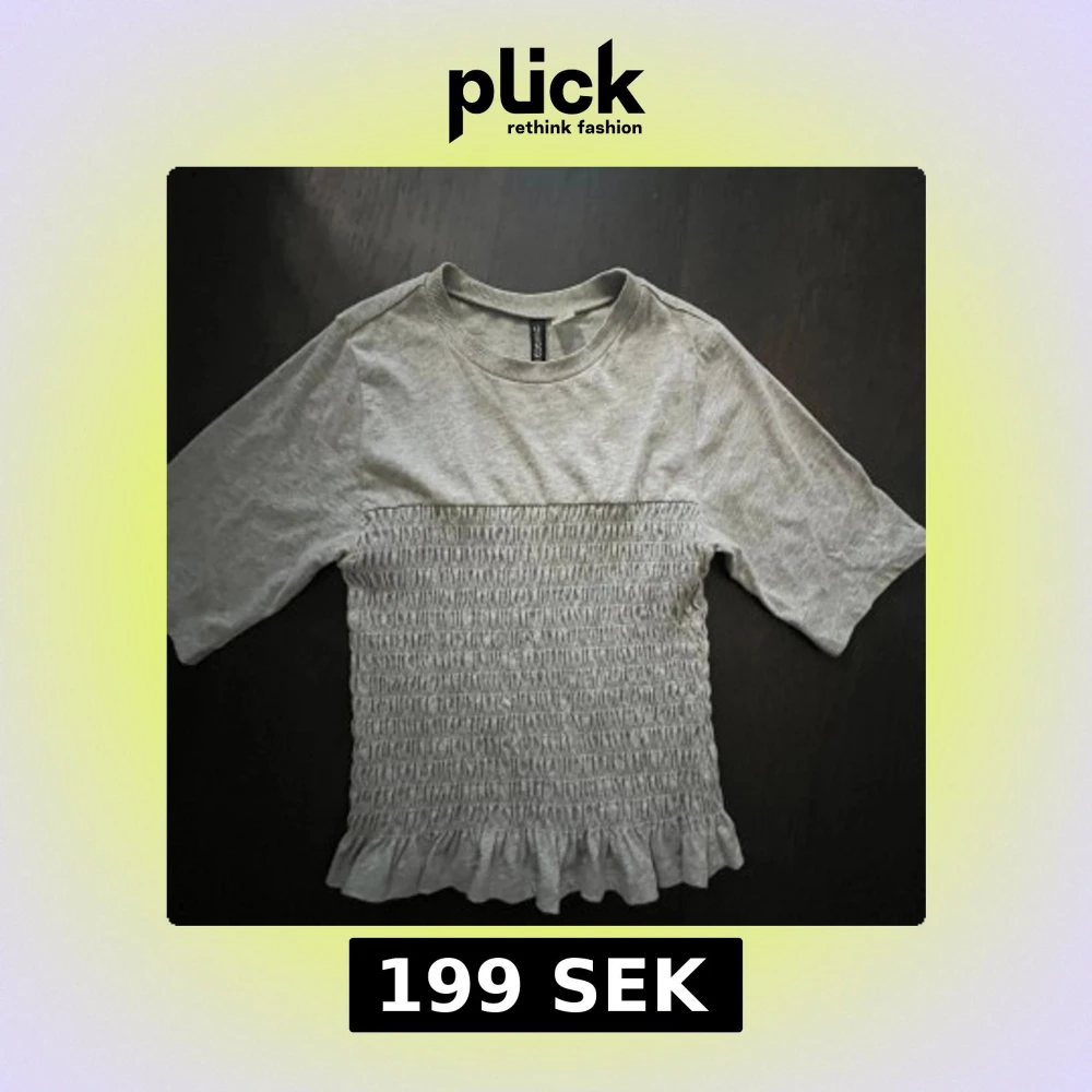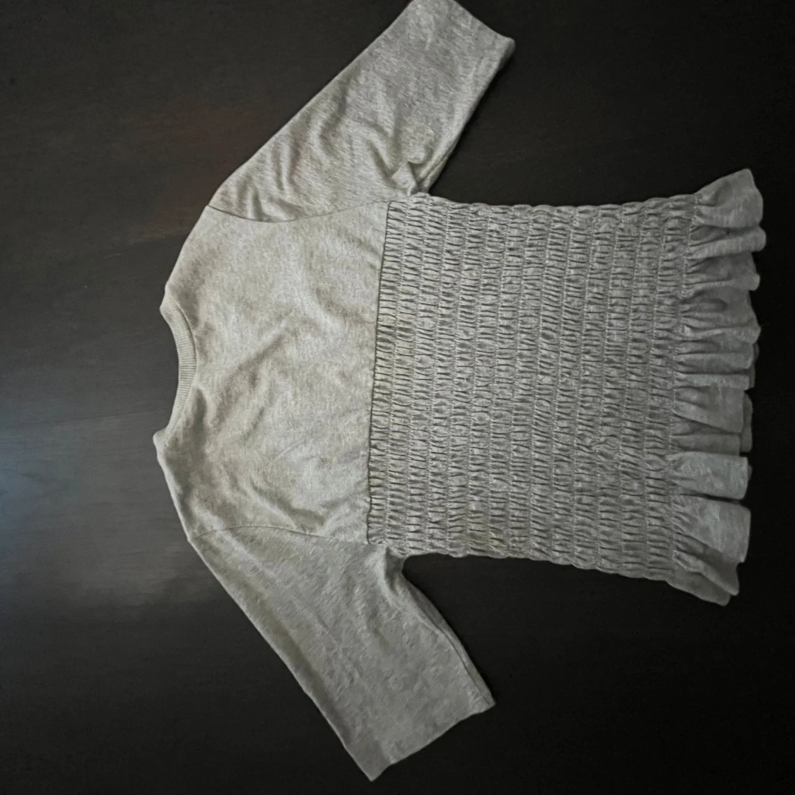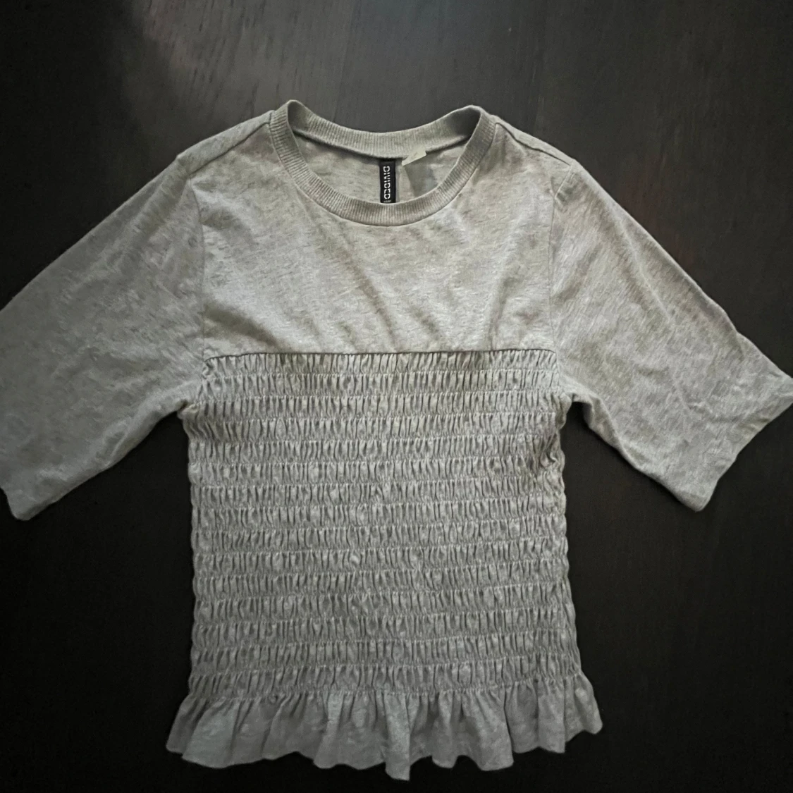 Säljer en ljusgrå topp från H&M Divided med smockad midja och volangkant nedtill. Toppen har korta ärmar och rund halsringning. Perfekt för en avslappnad och trendig look.