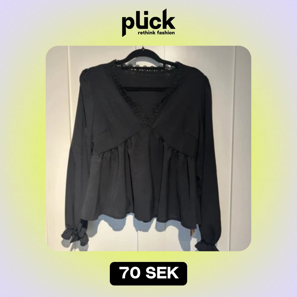 Säljer en elegant svart blus med spetsdetaljer vid halsringningen. Blusen har långa ärmar med knytband vid ärmsluten och en v-ringad design. Perfekt för höst och vinter, både till vardags och festliga tillfällen.