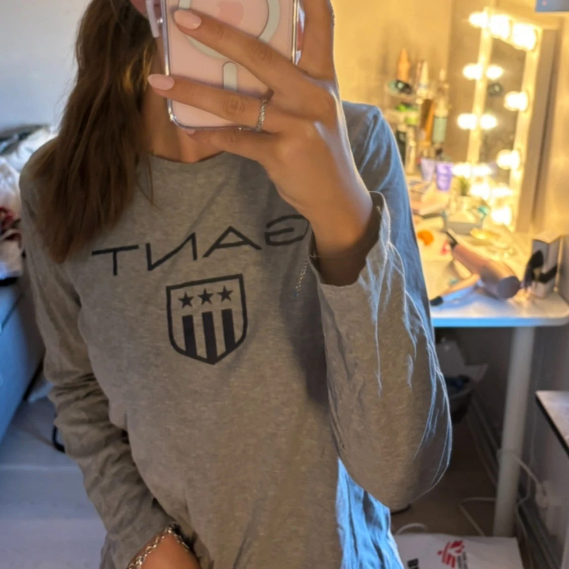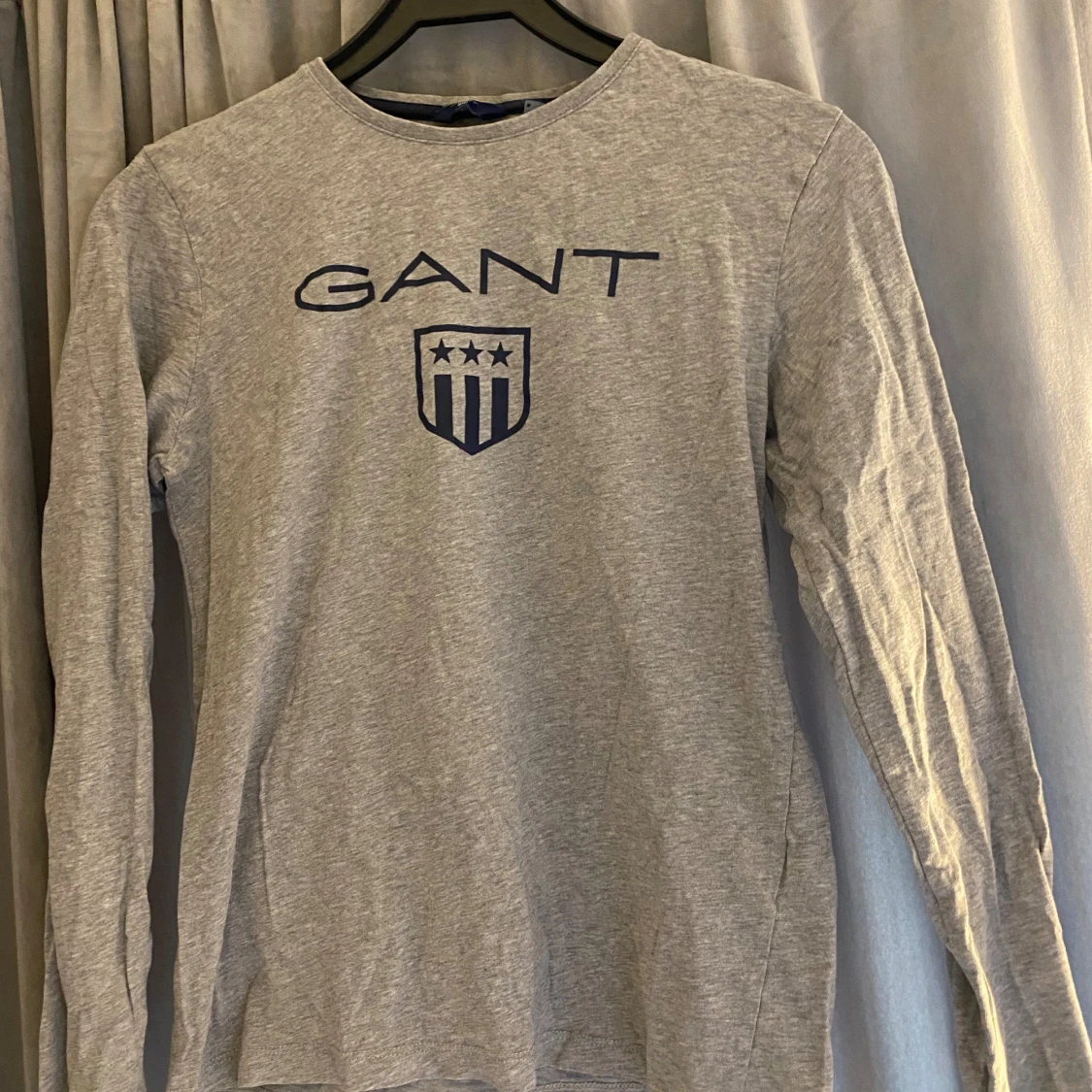 Säljer en stilren grå långärmad tröja från GANT. Den har en klassisk rund halsringning och ett snyggt tryck med GANT-loggan på framsidan. Perfekt för en avslappnad men ändå stilfull look. Tröjan är i bra skick och passar perfekt till både vardag och lite mer uppklädda tillfällen. Passar mig (xs-s)🌟