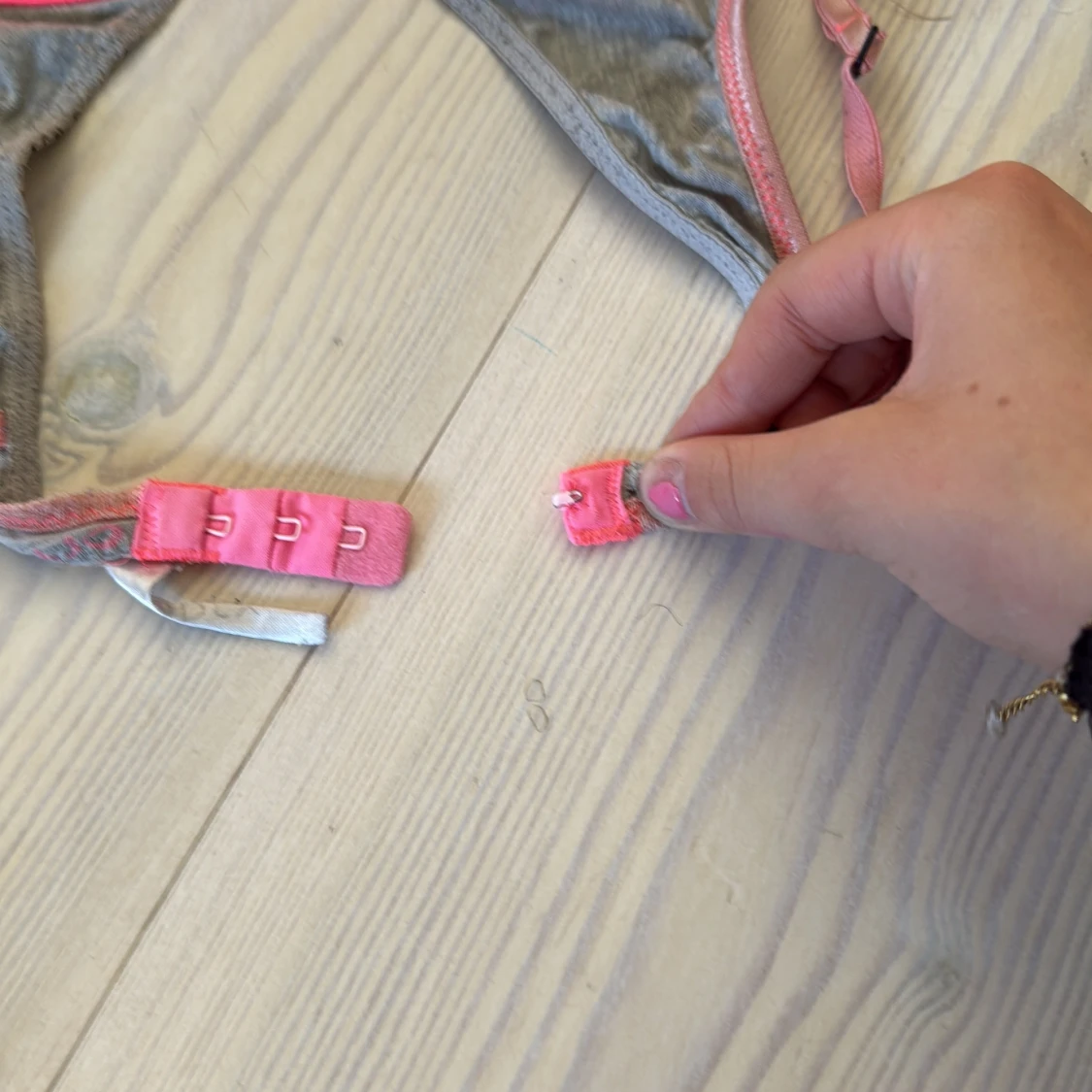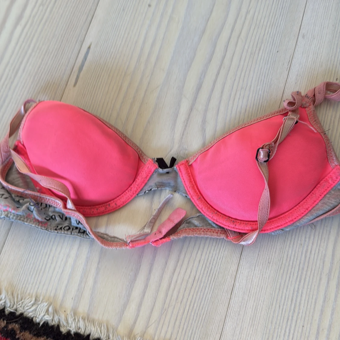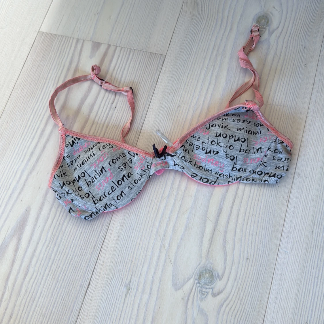 Säljer en bh från Index med grå bas och rosa detaljer. Bh har ett coolt textmönster med stadnamn och justerbara axelband. Insidan är neonrosa och den har en liten svart rosett framtill. Materialet är mjukt och stretchigt.