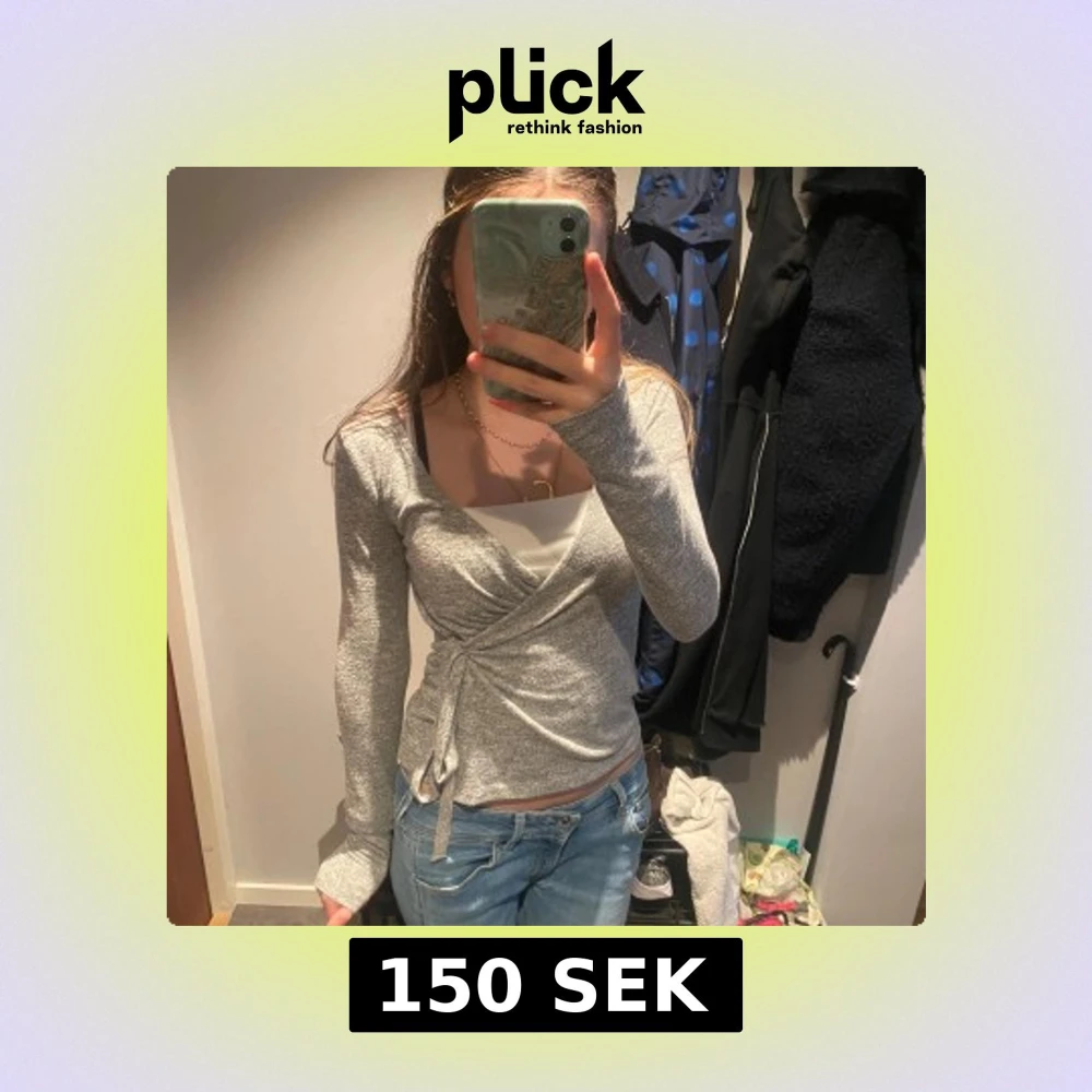 Säljer en grå omlottopp med långa ärmar och knyt i sidan. Toppen har en v-ringad design och är i mjukt, stretchigt material. Perfekt att styla med jeans eller kjol för en chill look.
