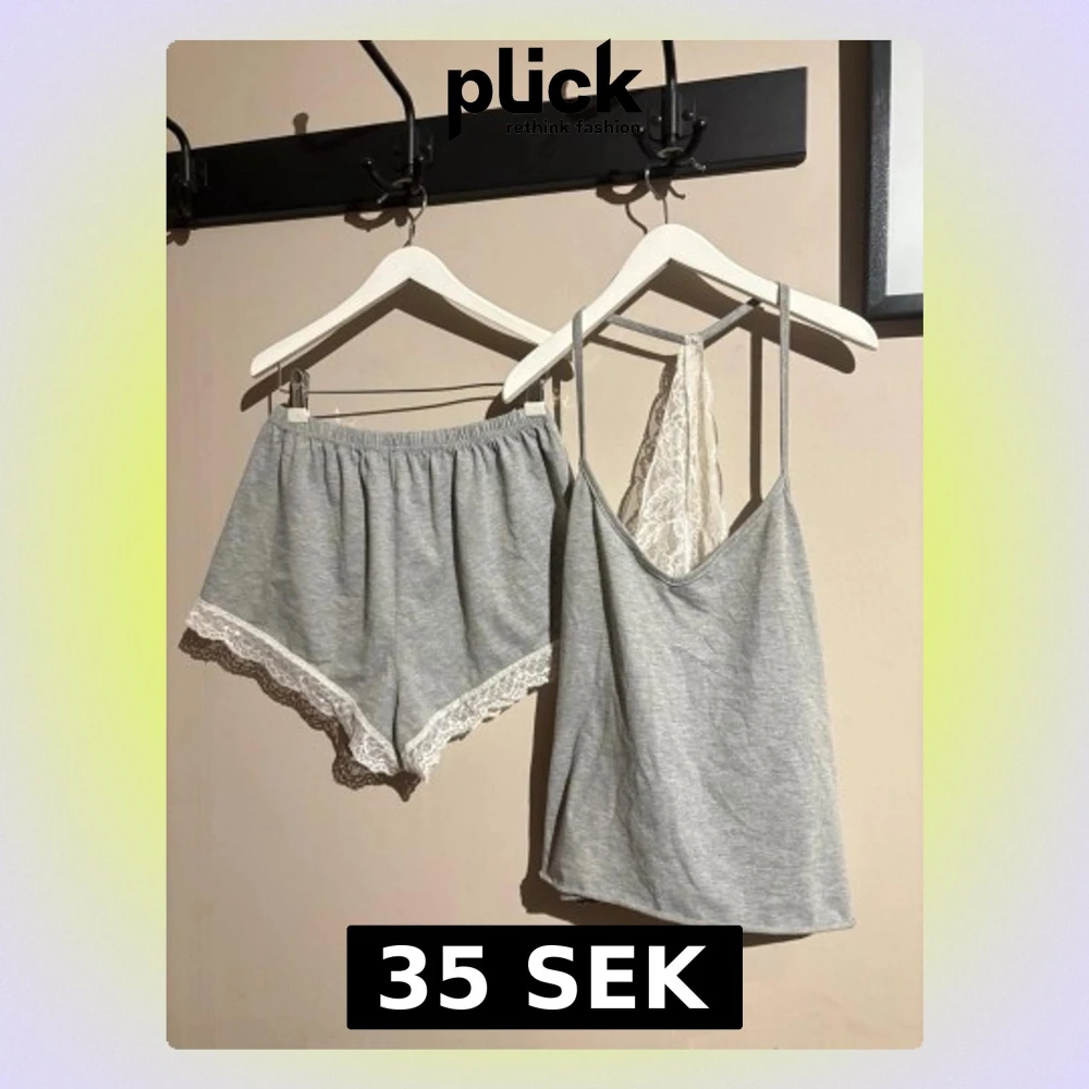 Säljer en ljusgrå linnetopp med smala axelband och vit spets i ryggen. Toppen är ärmlös och har en mjuk, flowy passform. Materialet är bomull med inslag av syntet, vilket gör den skön att ha på sig. Perfekt för chill dagar hemma eller som mysplagg.