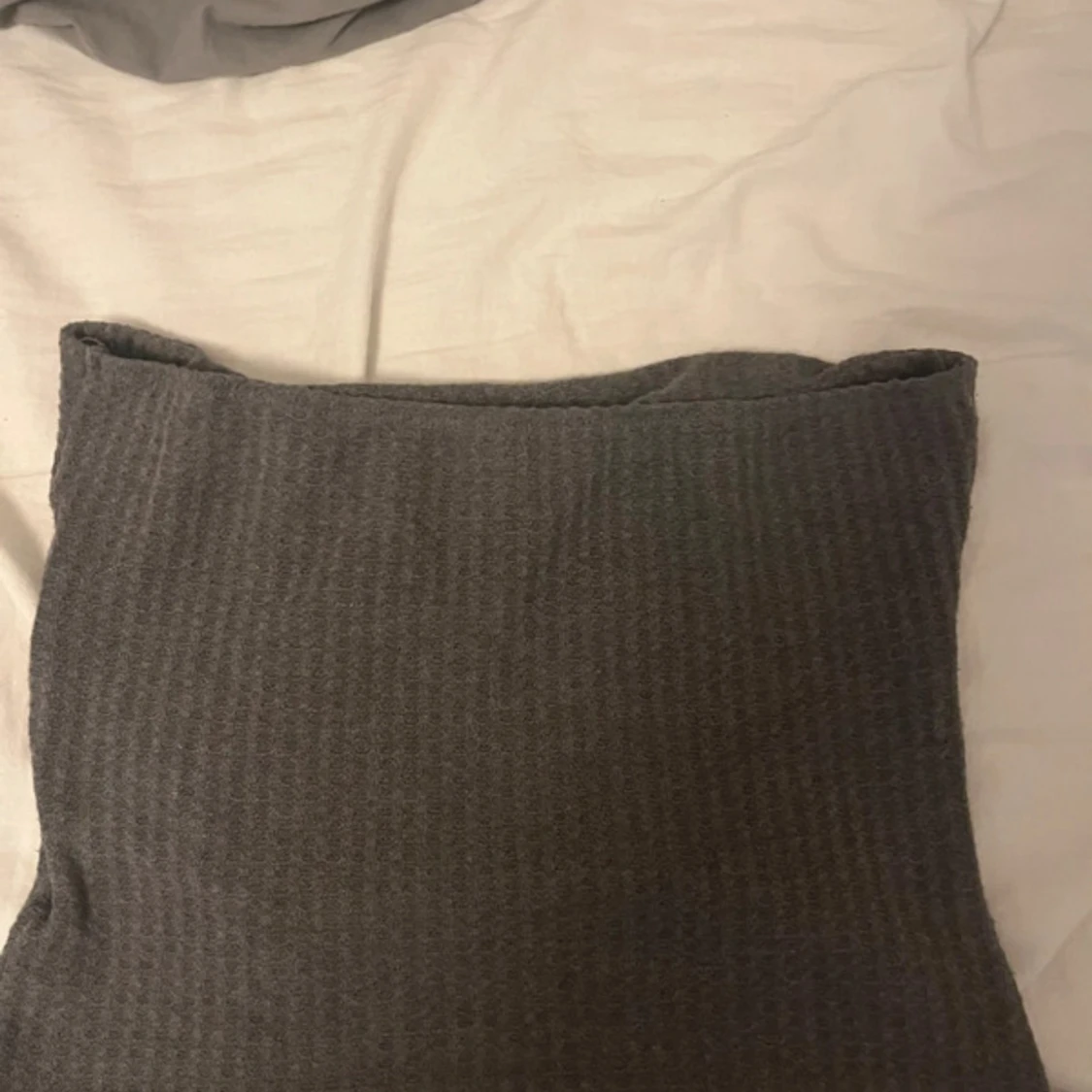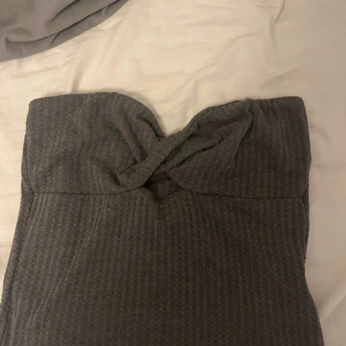 Säljer en grå bandeau tubtopp med twistad detalj framtill och liten cutout under bysten. Toppen är ribbad och har en tight passform som sitter snyggt på kroppen. Perfekt för dig som gillar minimalistisk stil med en twist.