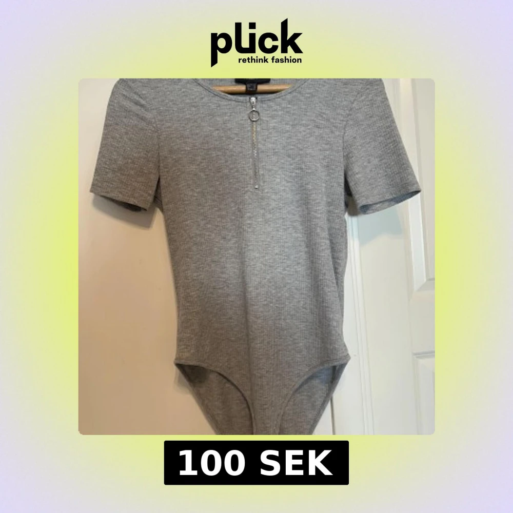 Säljer en grå ribbad bodysuit från Primark med korta ärmar och rund halsringning. Framtill finns en dekorativ dragkedja med ringdetalj. Perfekt att styla med jeans eller kjol. Den är använd några gånger men är i ett jättebra skick.