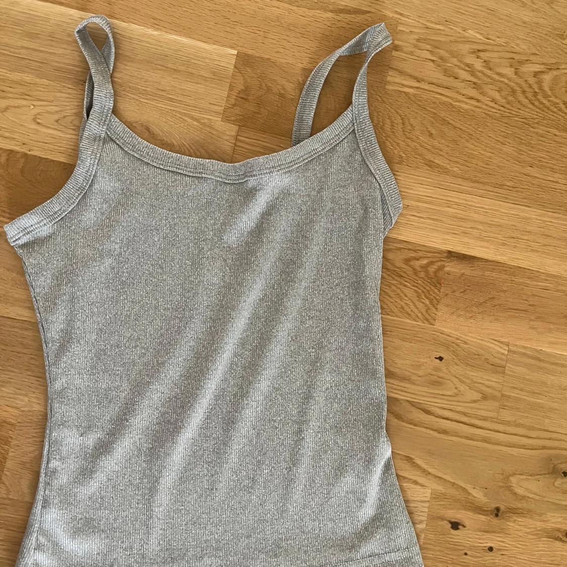 Säljer en enkel och stilren grå ribbad linnetopp från SHEIN. Toppen har smala axelband och är figurnära med stretchigt material. Perfekt att matcha med jeans eller kjol för en clean look.
