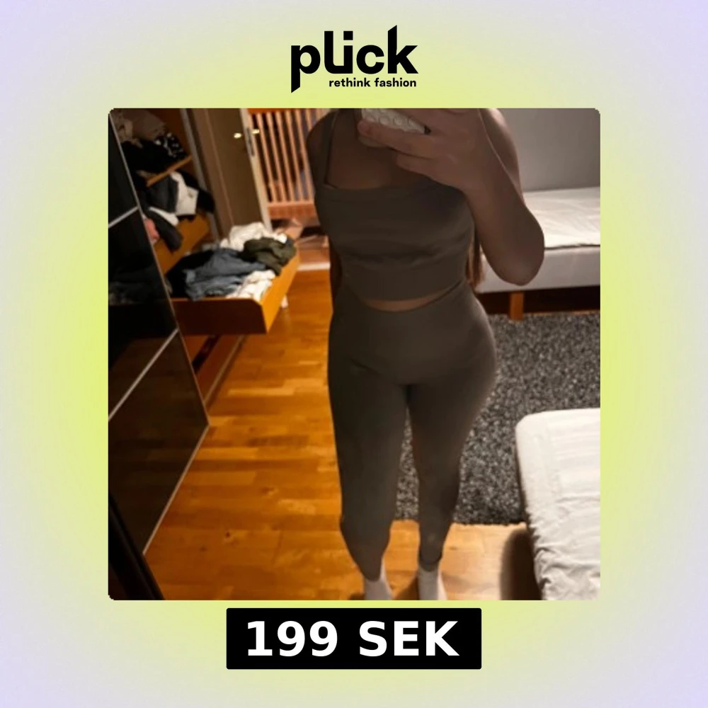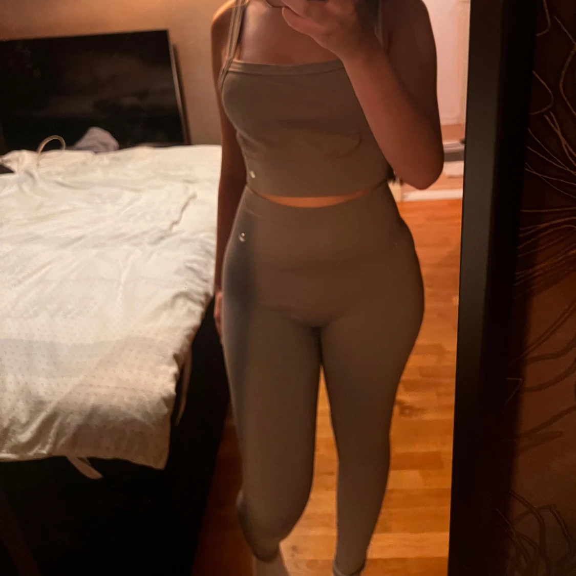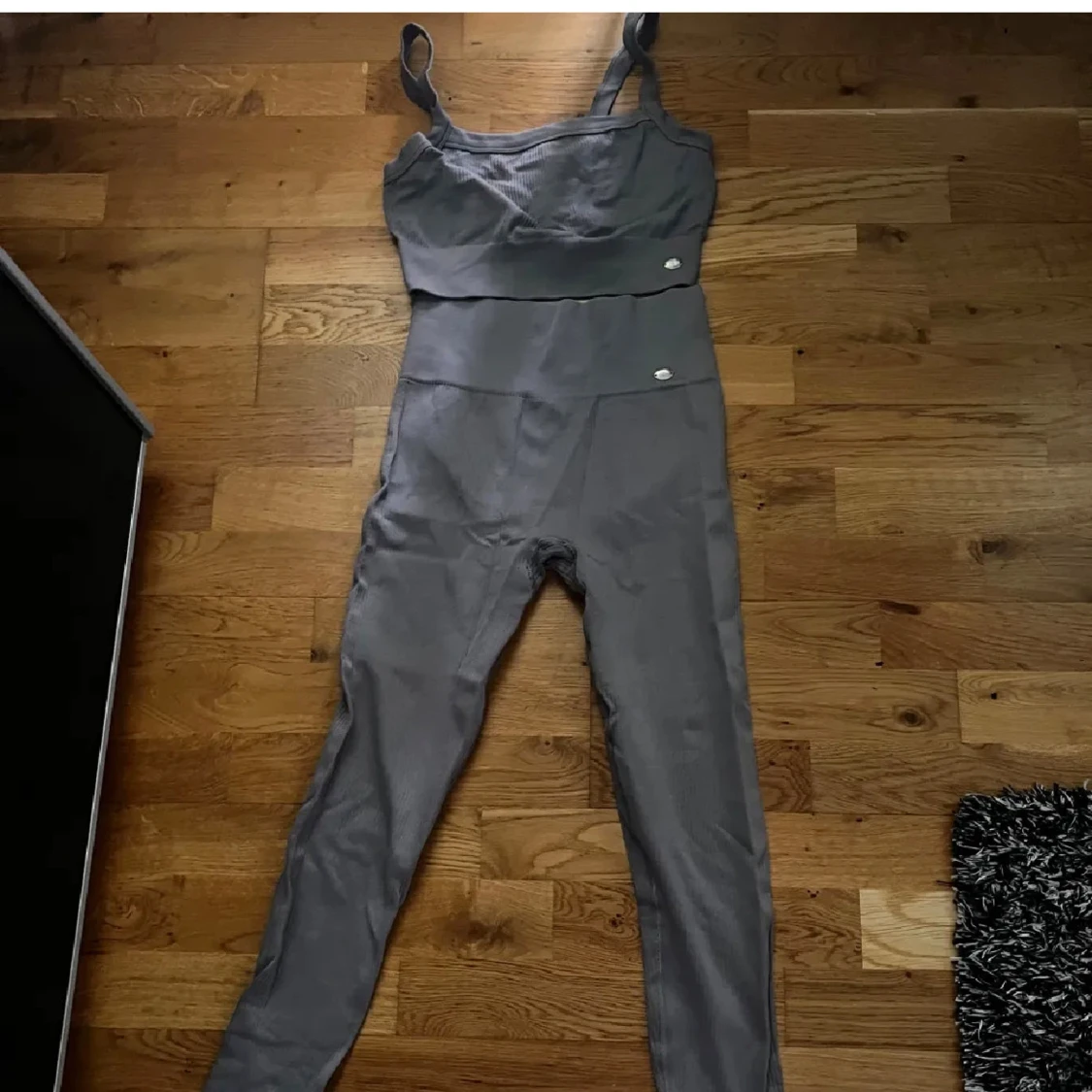 Säljer en grå/beige, tight träningsoverall från DOM (Drop of Mindfulness) i stretchigt material. Setet består av en ärmlös topp med breda axelband och matchande höga tights. Perfekt för gymmet eller yoga! Byxorna är storlek S toppen M