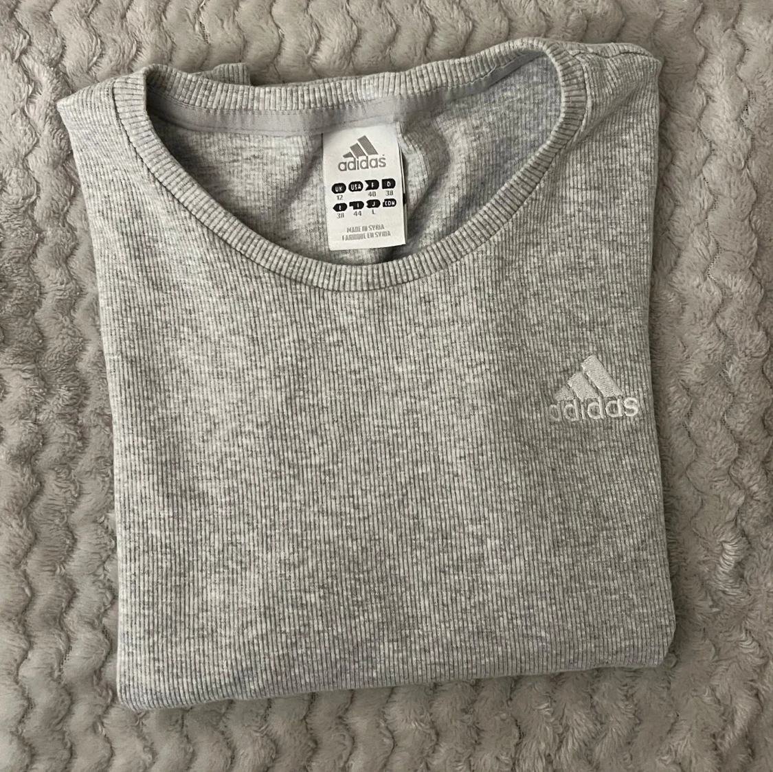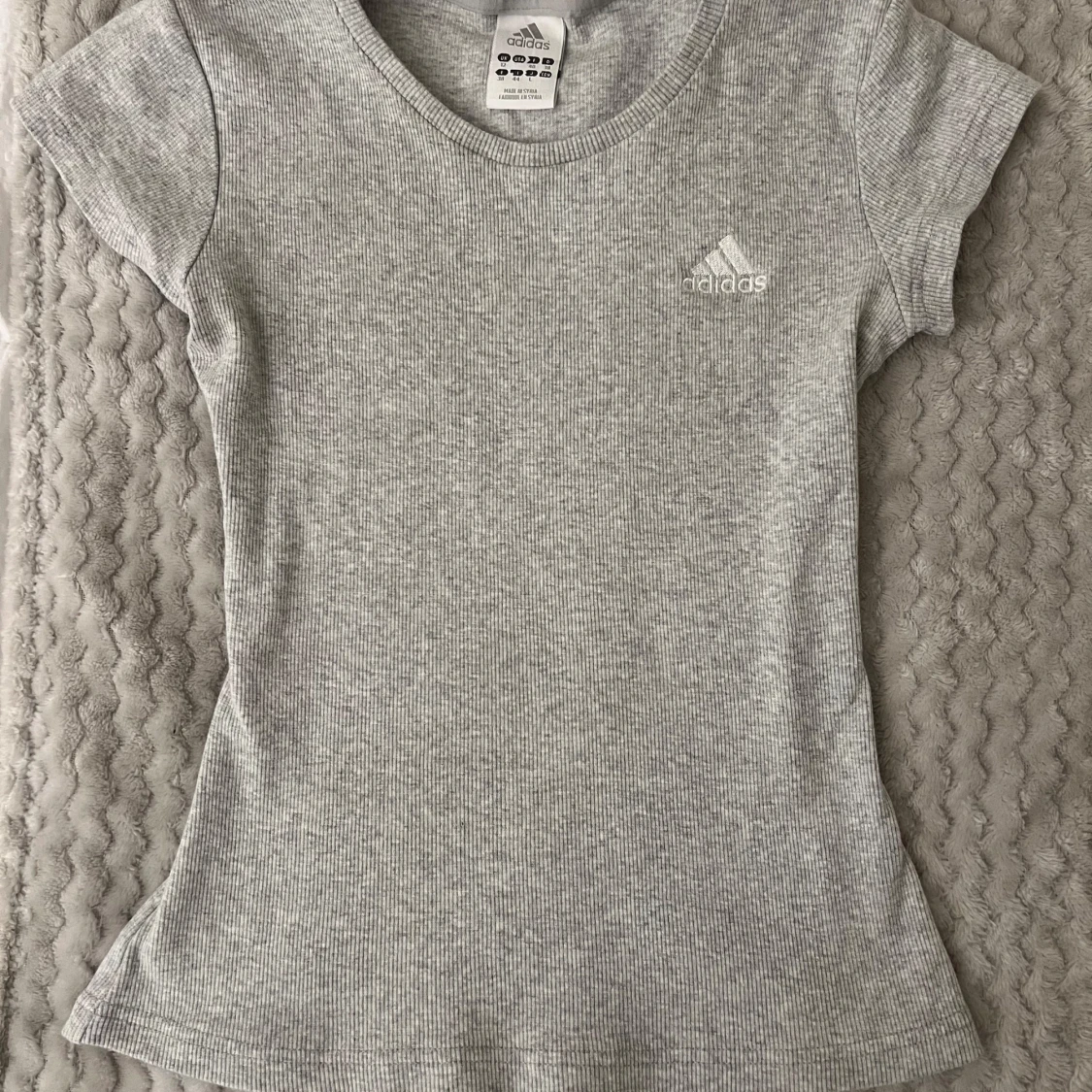 Säljer en vintage-stilren grå ribbad t-shirt från Adidas med korta ärmar och rund hals. Perfekt för en sportig look eller avslappnad stil. Adidas-loggan är diskret placerad på bröstet. Tight fit och väldigt nice!🦦