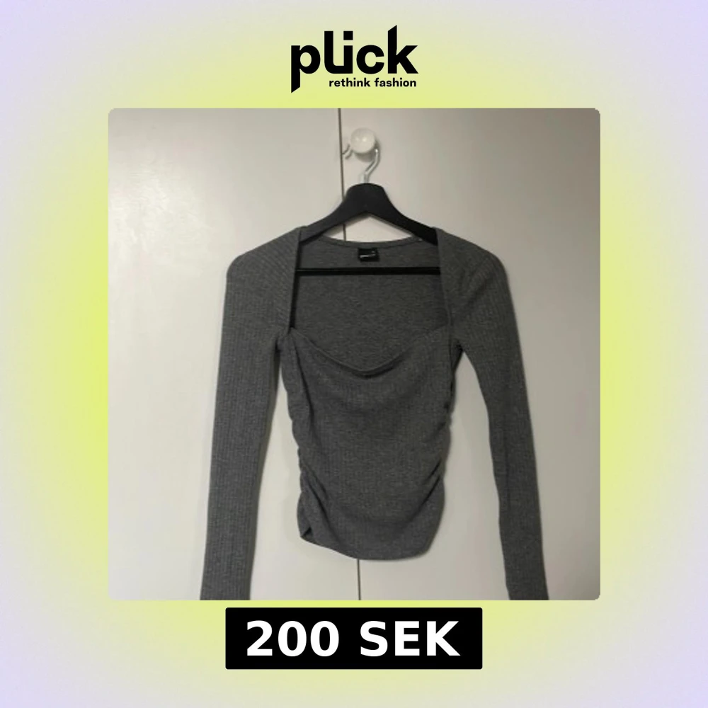 Säljer en grå långärmad topp i storlek xs från Gina Tricot i ribbat material. Toppen har en snygg draperad urringning och sitter tight. Endast använd några fåtal gånger men ser helt oanvänd ut.