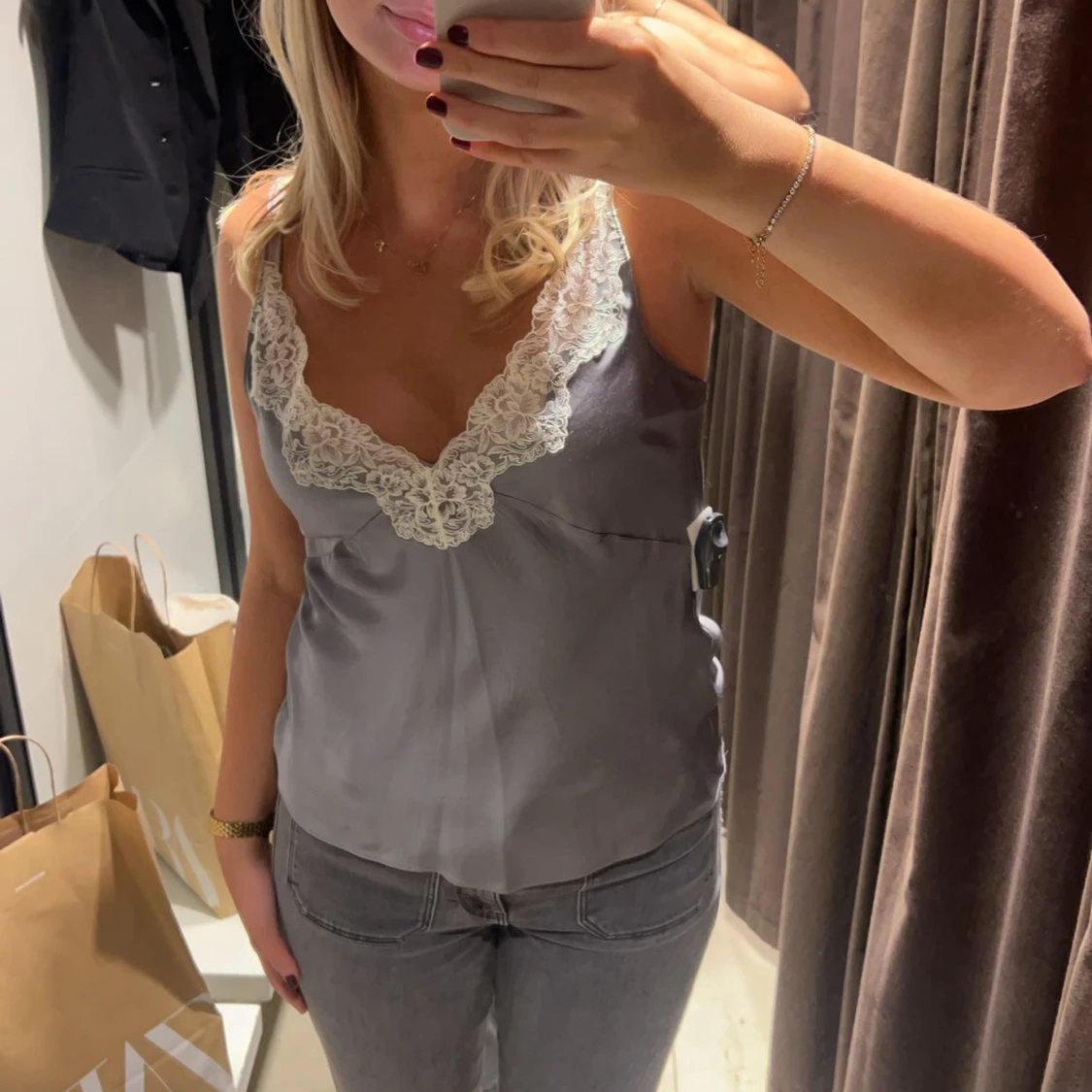Supersnygg grå linnetopp i siden med vit spets längs den djupa v-ringningen. Toppens tunna axelband och glansiga material ger en lyxig känsla. Perfekt att styla med jeans eller kjol för en trendig look.