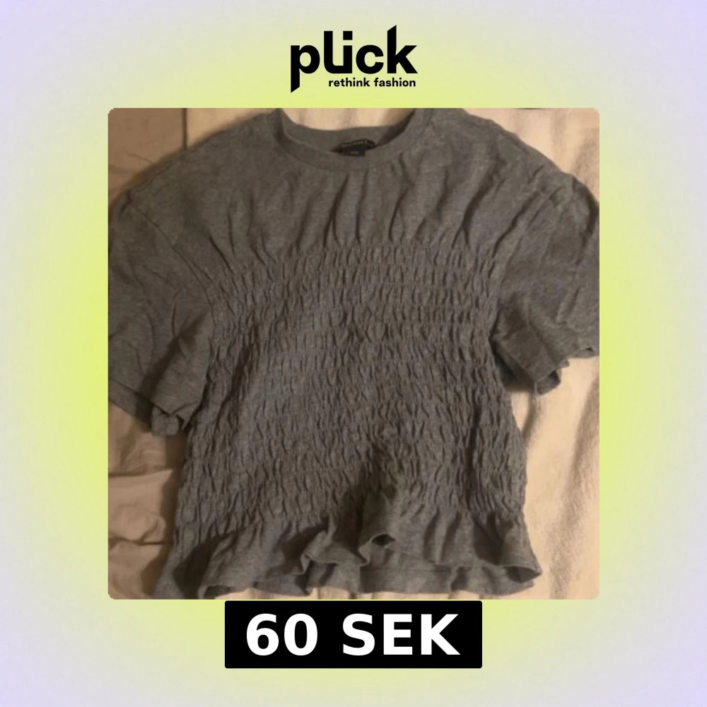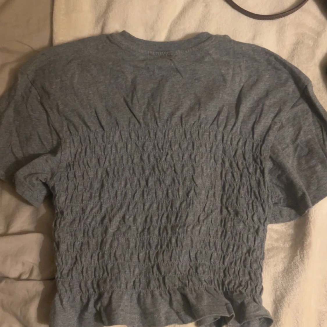 Grå topp från Monki med smockad midja och lätt volangkant nedtill. T-shirten har rund halsringning och korta ärmar. Tillverkad i mjuk bomull, perfekt för en chill och stilren look.