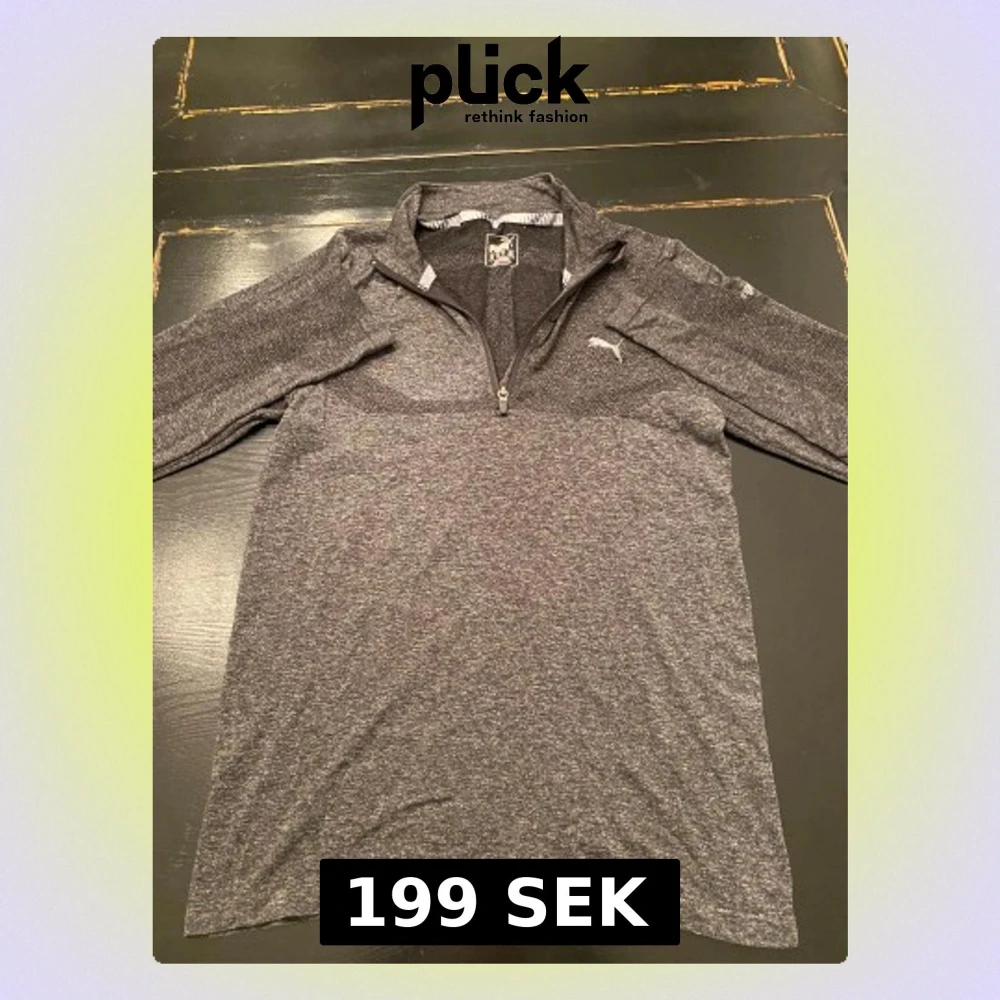 Sportig grå långärmad topp från Puma med half zip och ståkrage. Jag har använt denna när jag golfat och spelat fotboll och det håller värme bra för att vara så tunn. Jag är 190 cm och tröjan är lite kort så den är stor för sin storlek.