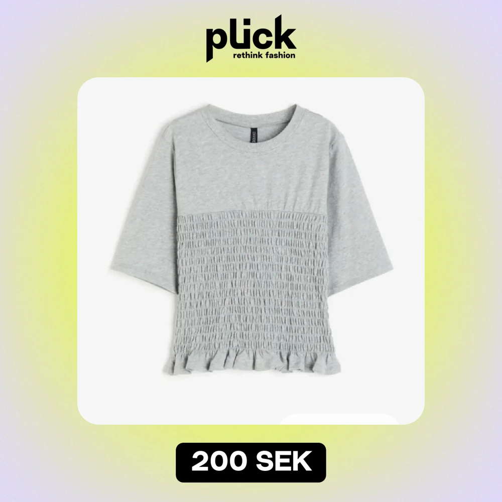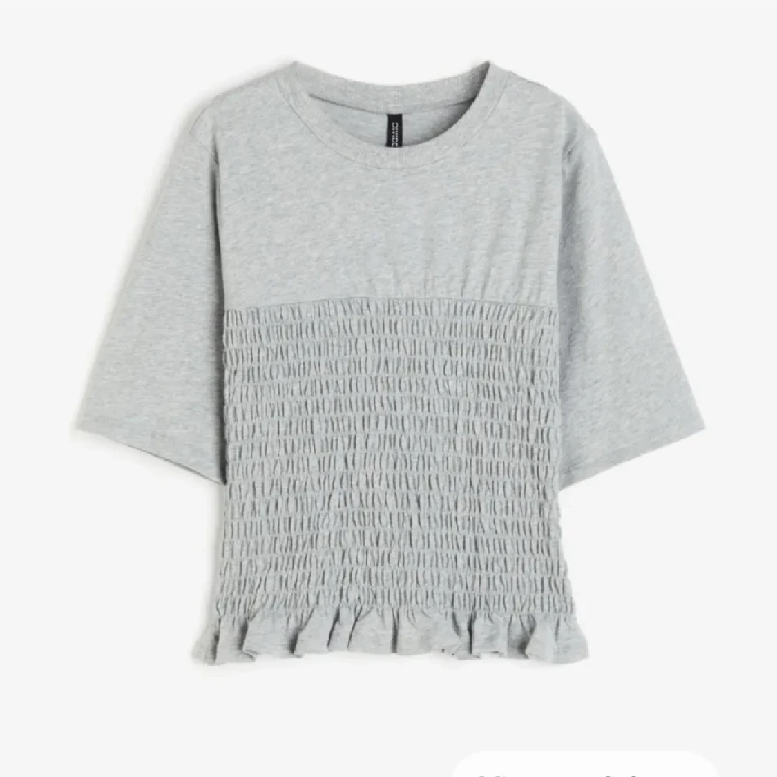 Säljer en söt grå topp med trekvartsärm och volangdetalj längst ner. Toppen har en ribbad struktur på mitten som ger en fin textur. Perfekt för vardagsbruk eller en festligare tillställning