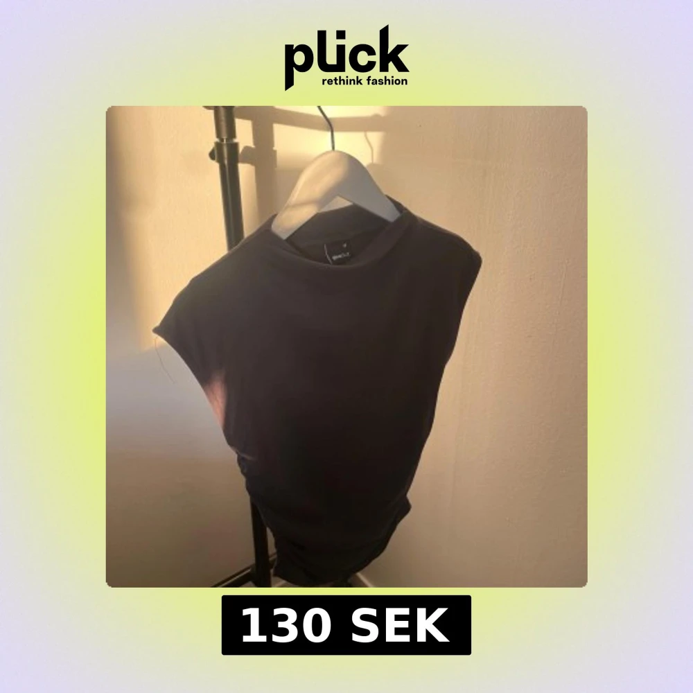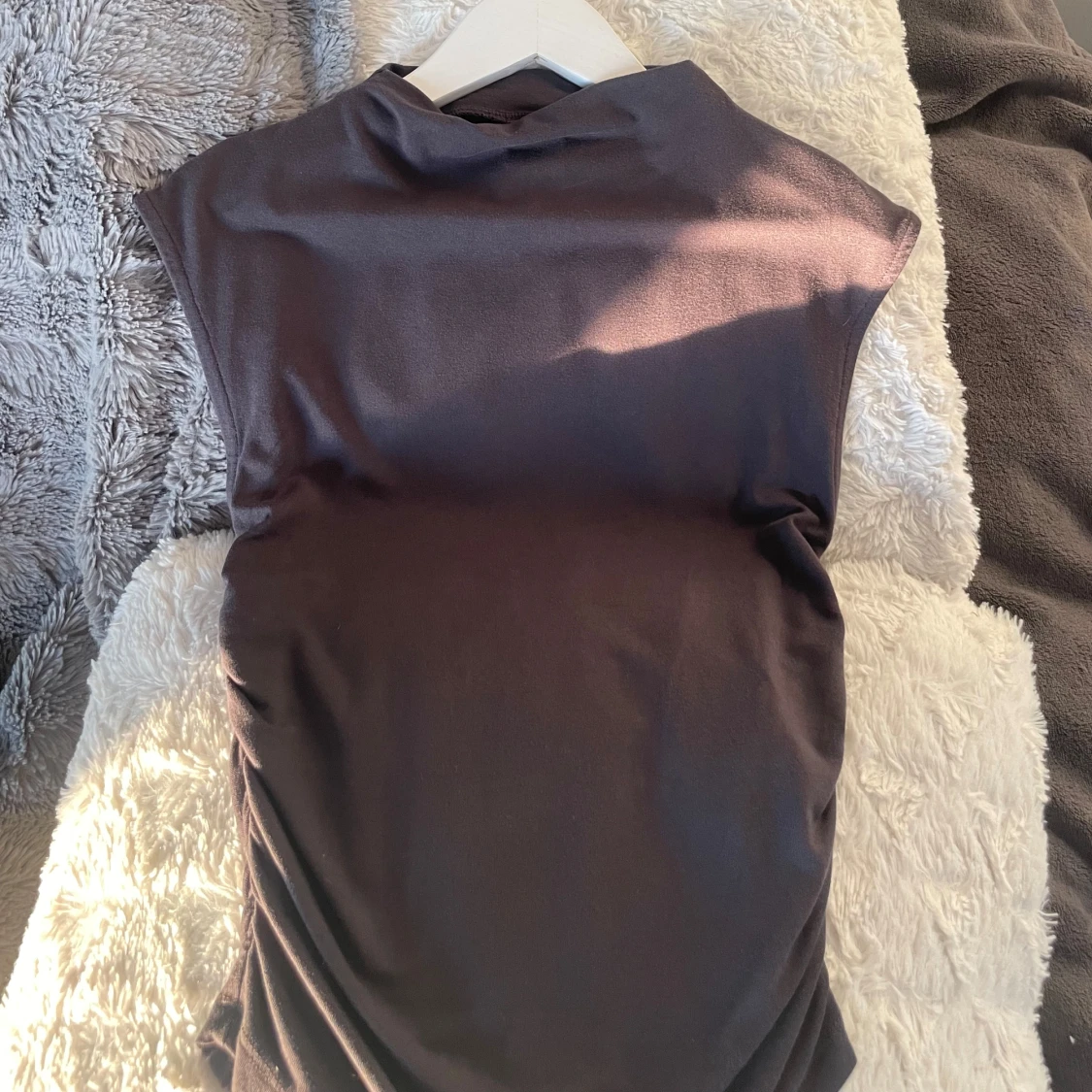 Säljer en mörkgrå, ärmlös topp med rund halsringning.