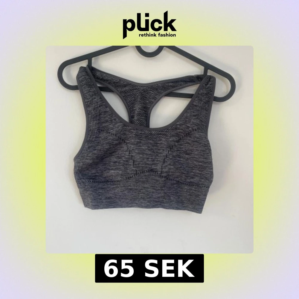 Träningstopp med grå ribbad färg. Perfekt till träning (har ingen fyllning i sig) oh har en korsning därbak. Vet inte vart den är köpt men den är i storlek s/ men passar M. Aldrig använt den.