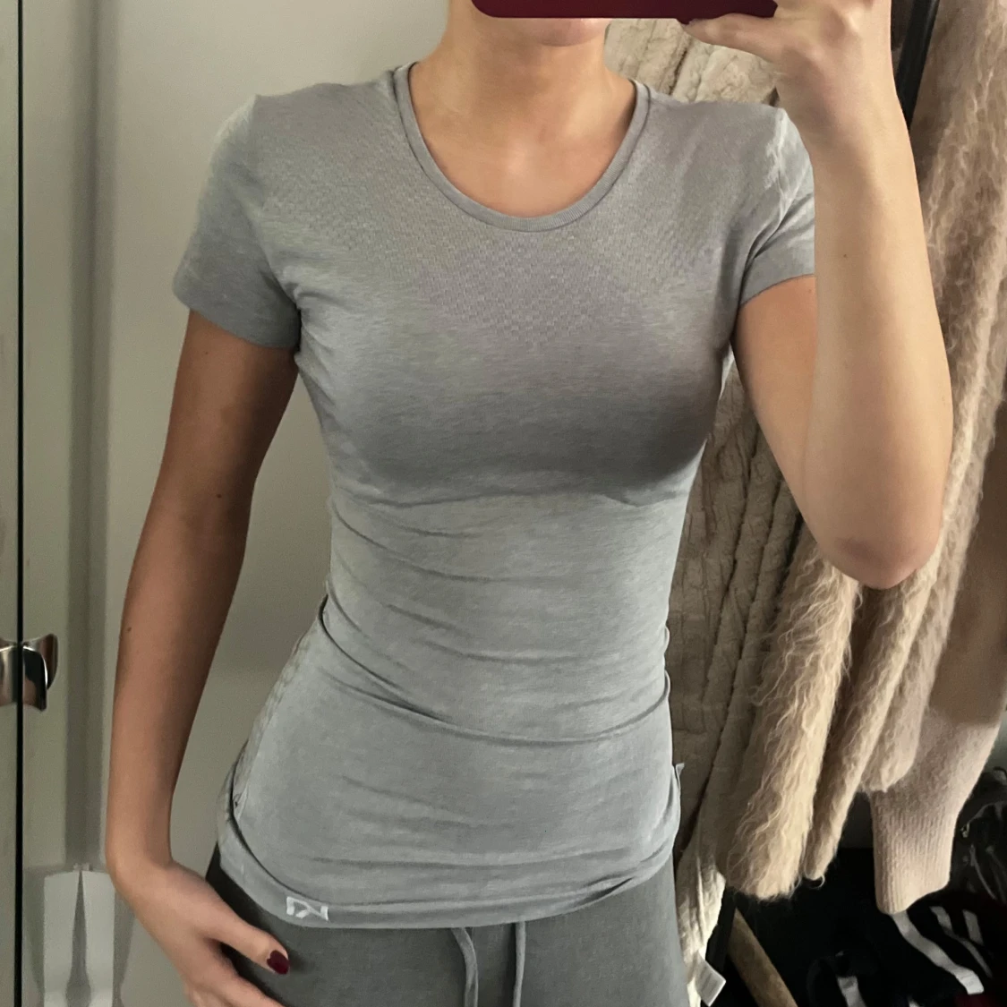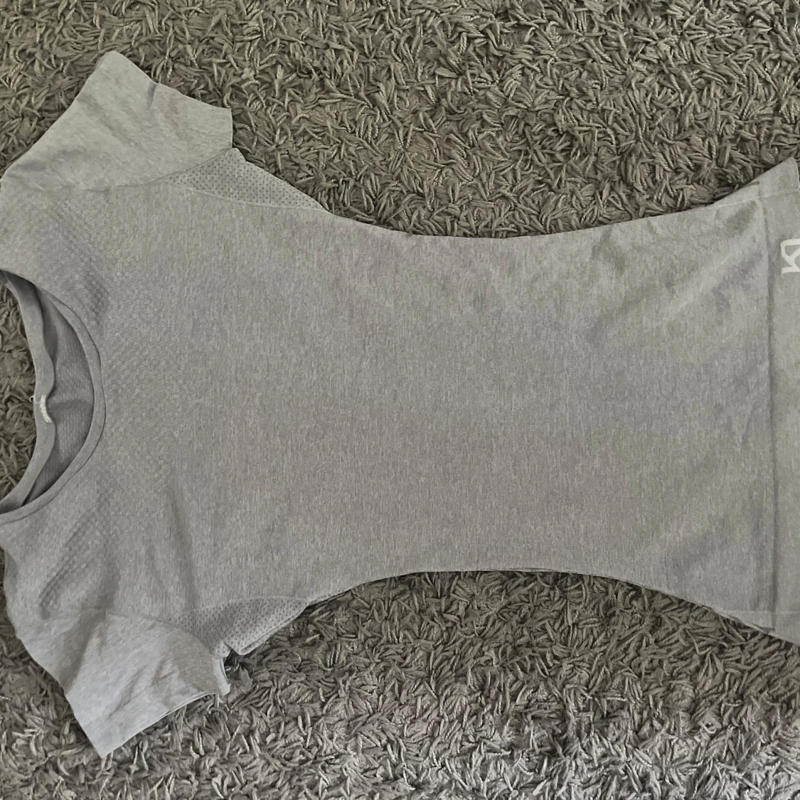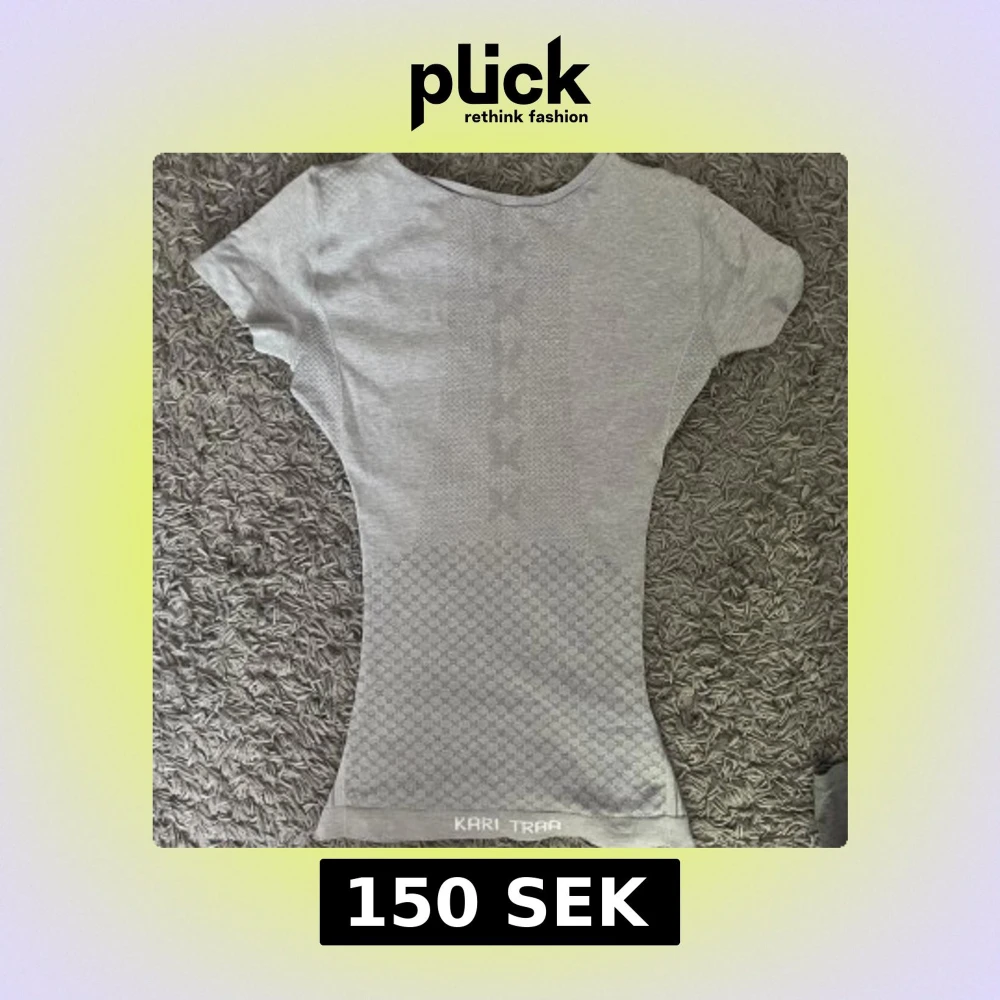 Superskön grå träningstopp från Kari Traa med diskret mönster och tight passform. T-shirten är kortärmad och har rund halsringning. Är insydd vid midjan