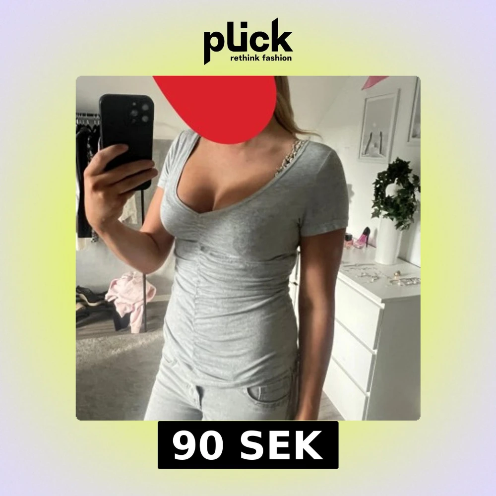 Säljer en ljusgrå topp med v-ringning och korta ärmar. Toppen har snygg rynkdetalj framtill som ger en smickrande passform. Tillverkad i mjuk bomull och passar perfekt till jeans eller kjol.