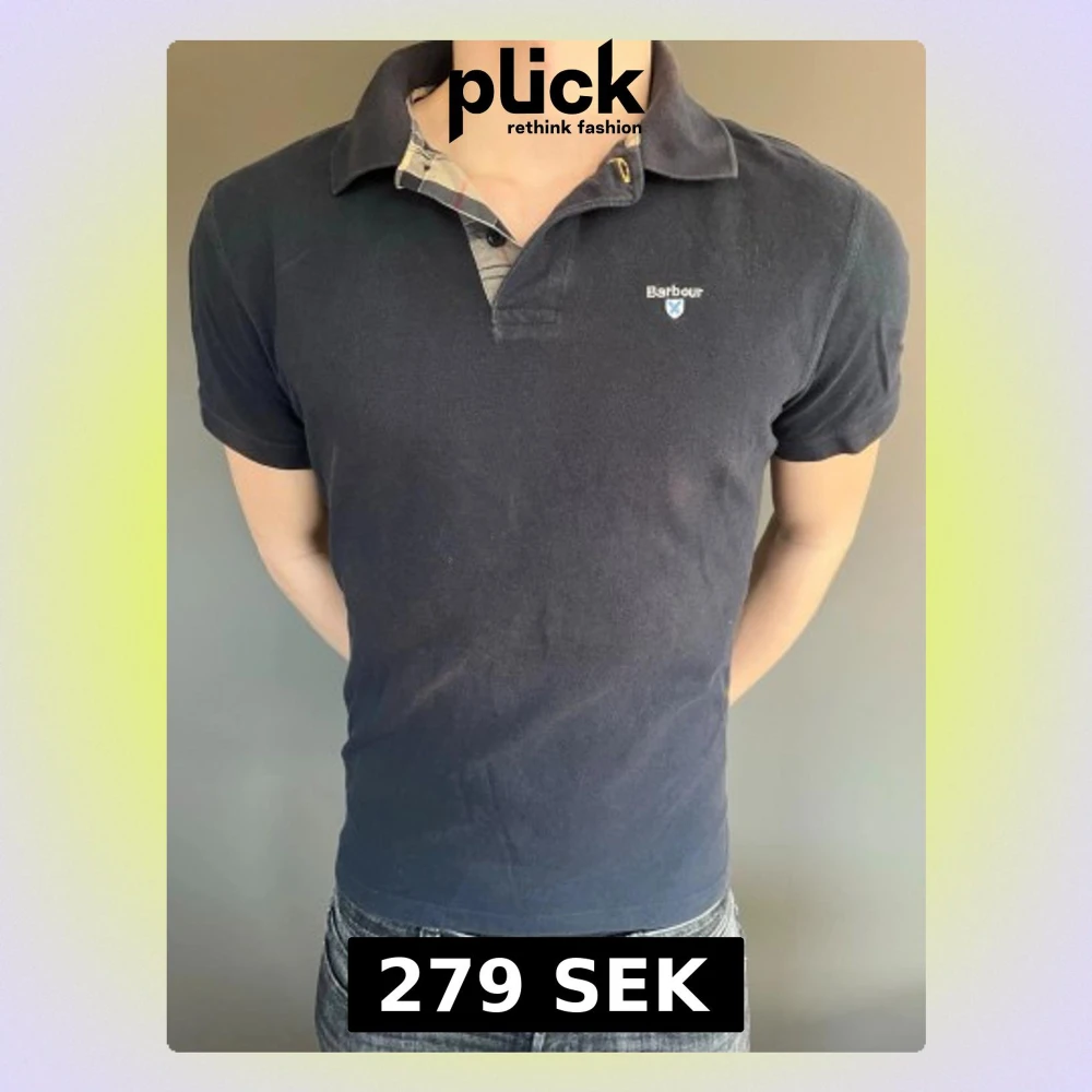 Klassisk mörkblå pikétröja från Barbour med korta ärmar och krage. Tröjan har en liten logotyp på bröstet och rutigt tyg på insidan av kragen. Perfekt för en stilren och avslappnad look.