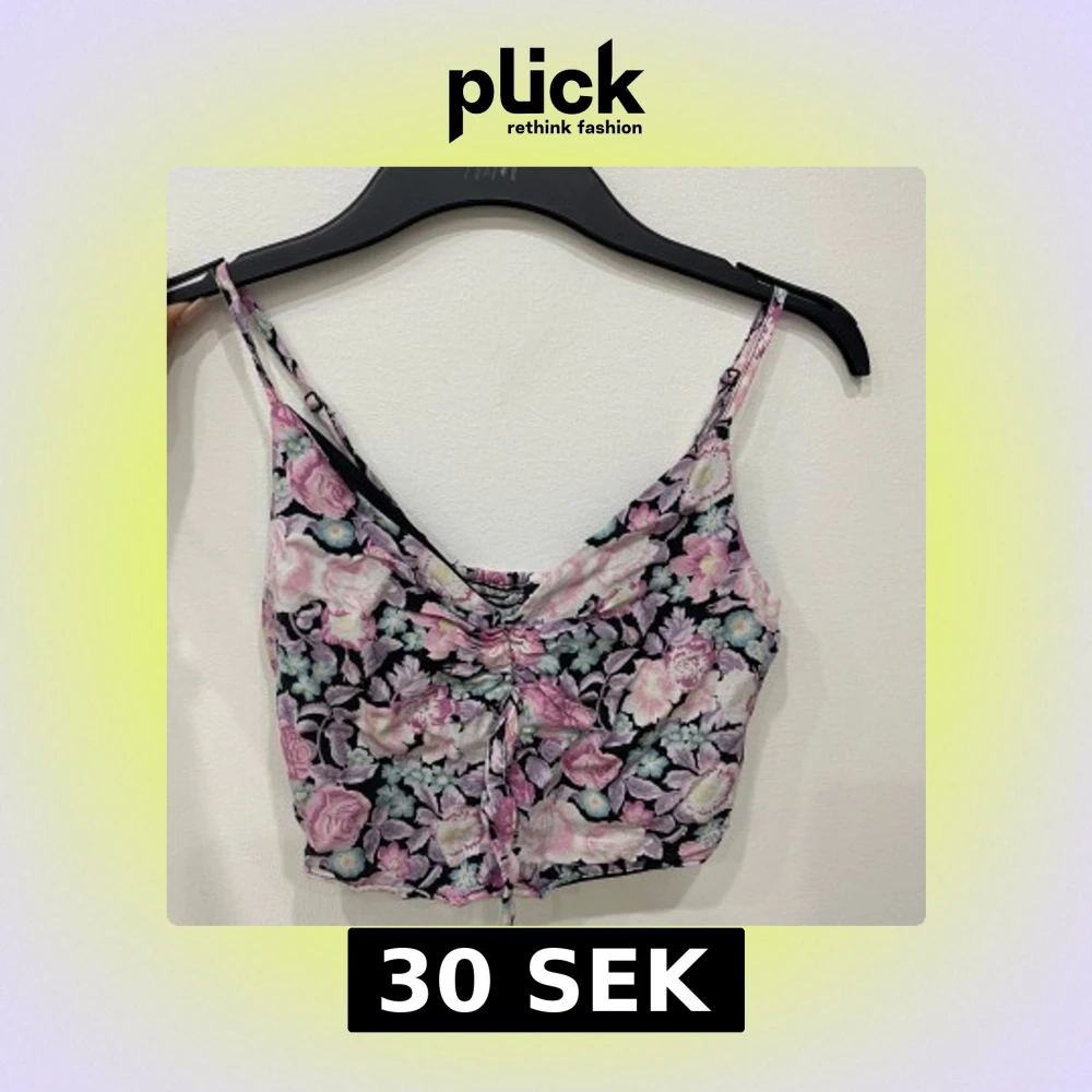 Superfin croppad linnetopp från H&M med blommigt mönster i rosa, lila och vitt på svart botten. Toppen har smala axelband, v-ringning och snygg snörning framtill. Perfekt för sommarens alla tillfällen och ger en riktigt söt vibe.
