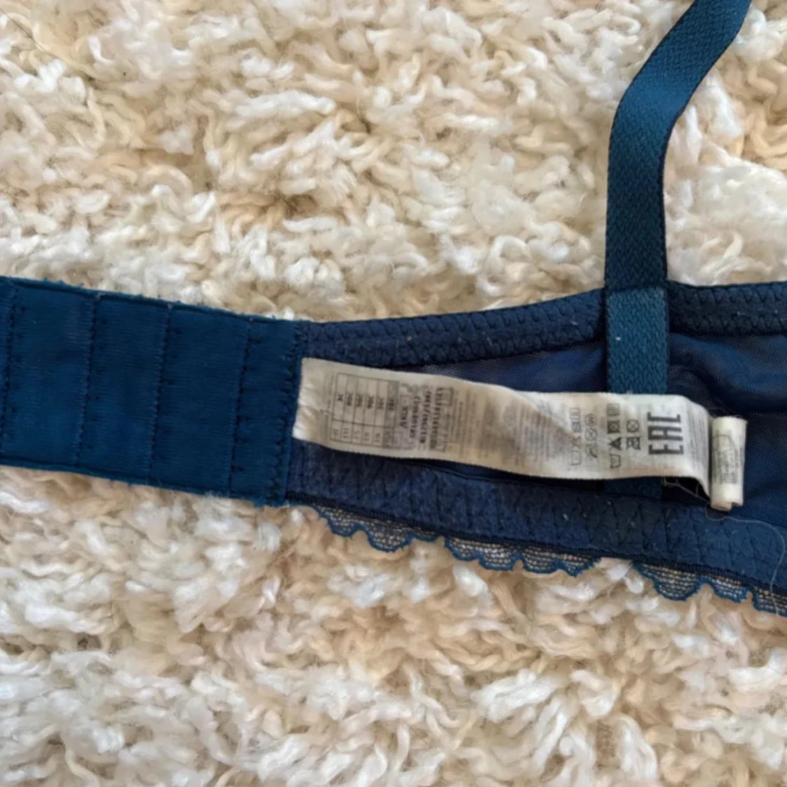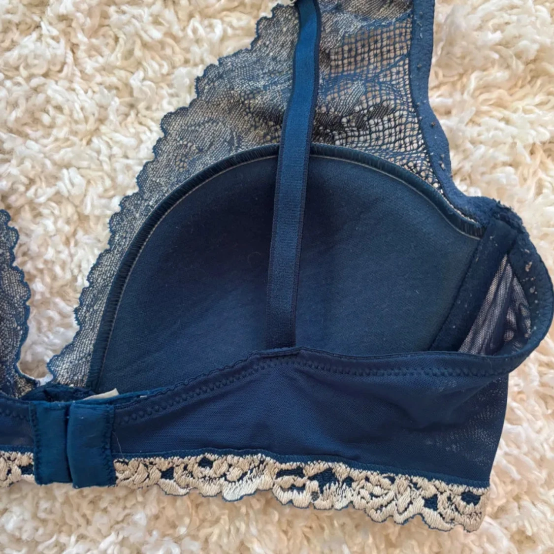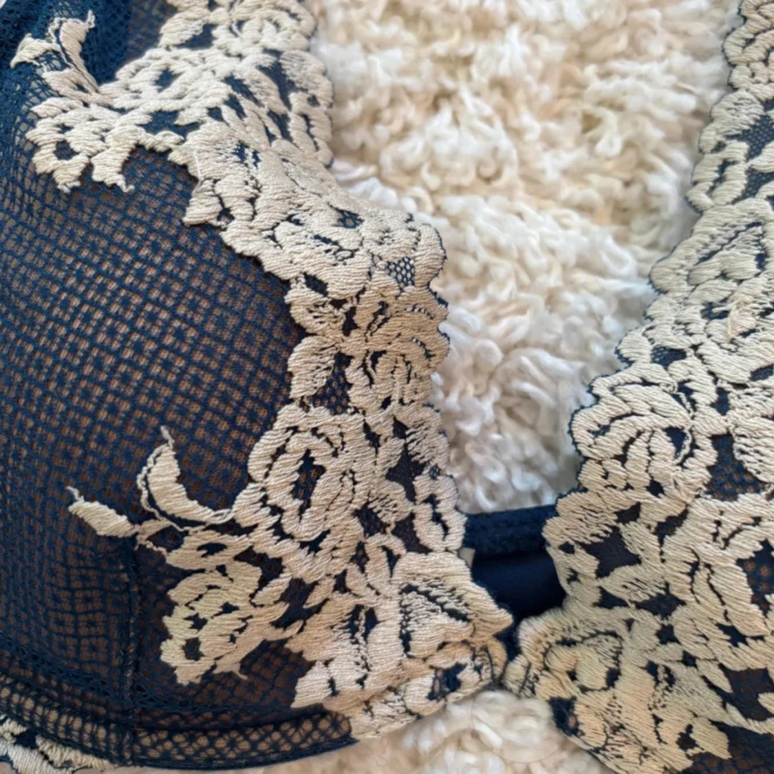 Supersnygg mörkblå bh med transparent mesh och beige broderade blommor längs axelbanden och kuporna. Blusen har spetsdetaljer och ett elegant blommigt mönster. Använt få tal gånger, det syns att jag har använt den men inga täcken på slitning!