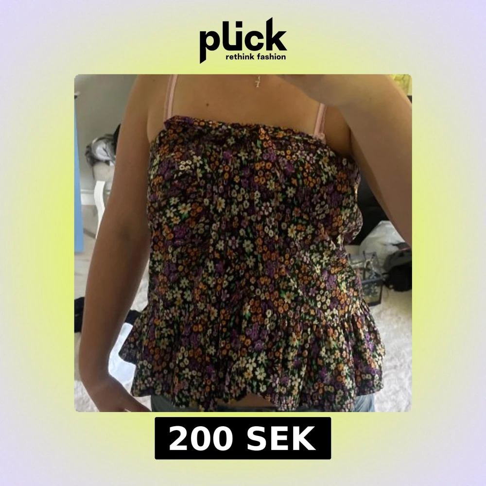 Säljer en söt linnetopp med blommigt mönster i lila, orange, vit och grön. Toppen har smala axelband och volang nertill, perfekt för varma dagar. Från pull and bear