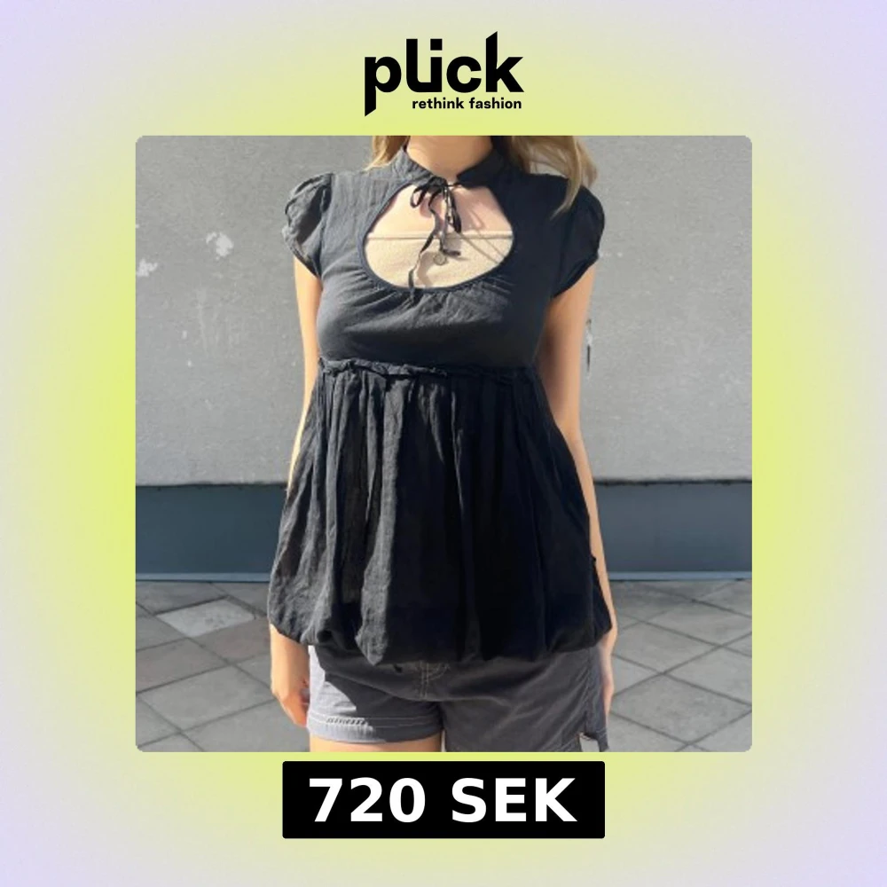Säljer min söta Cop.Copine blus med korta puffärmar och rund cut-out framtill. Påminner om babydoll toppar. Den har ett linne inuti som sitter fast/ingår som ett set. Storleken är italiensk M så typ S. Jag är XS och tror den kan passa upp till en mindre M. Säljer billigare på Plick än på Vinted, så passa på!!