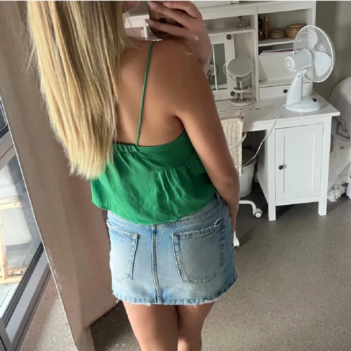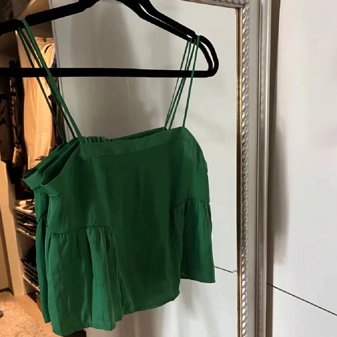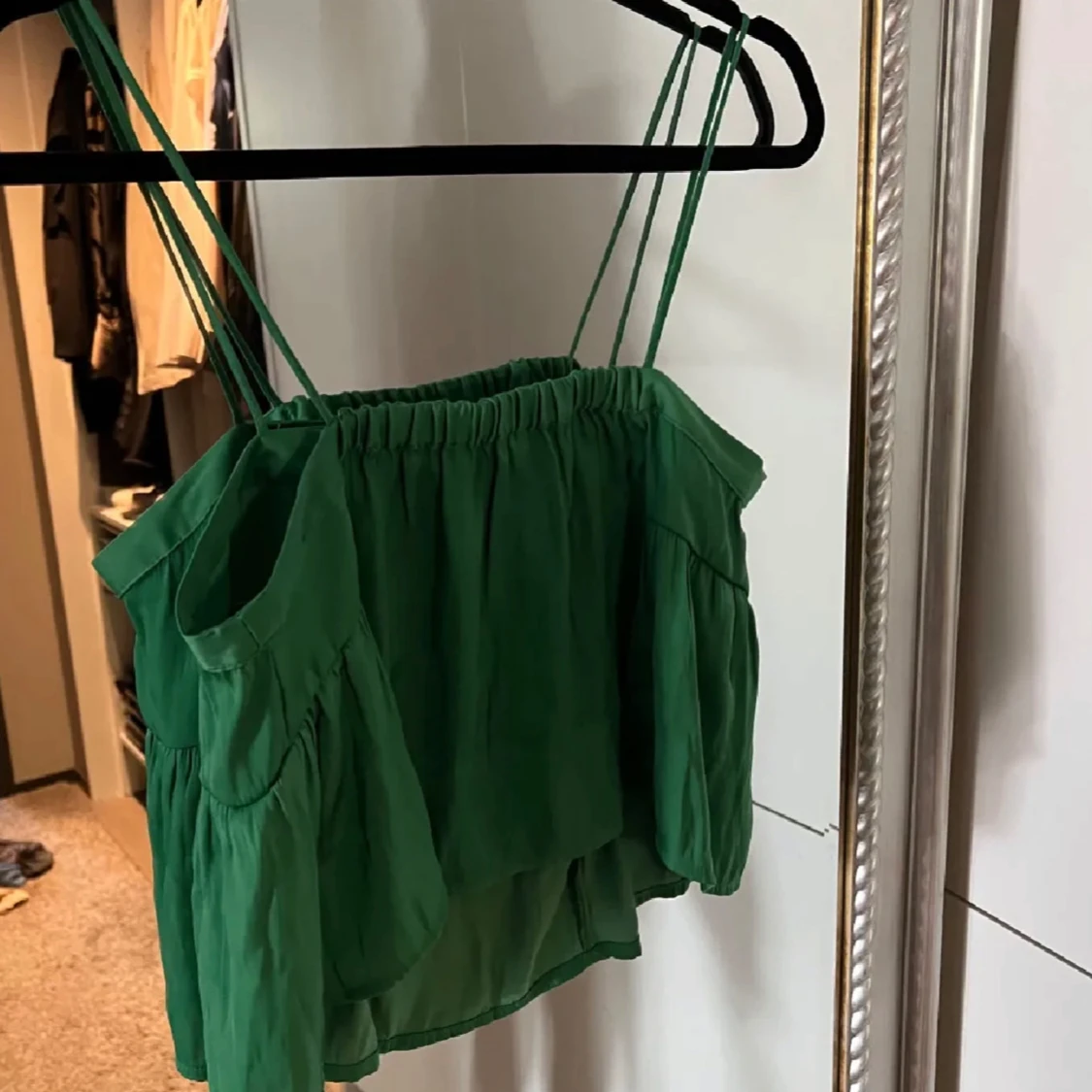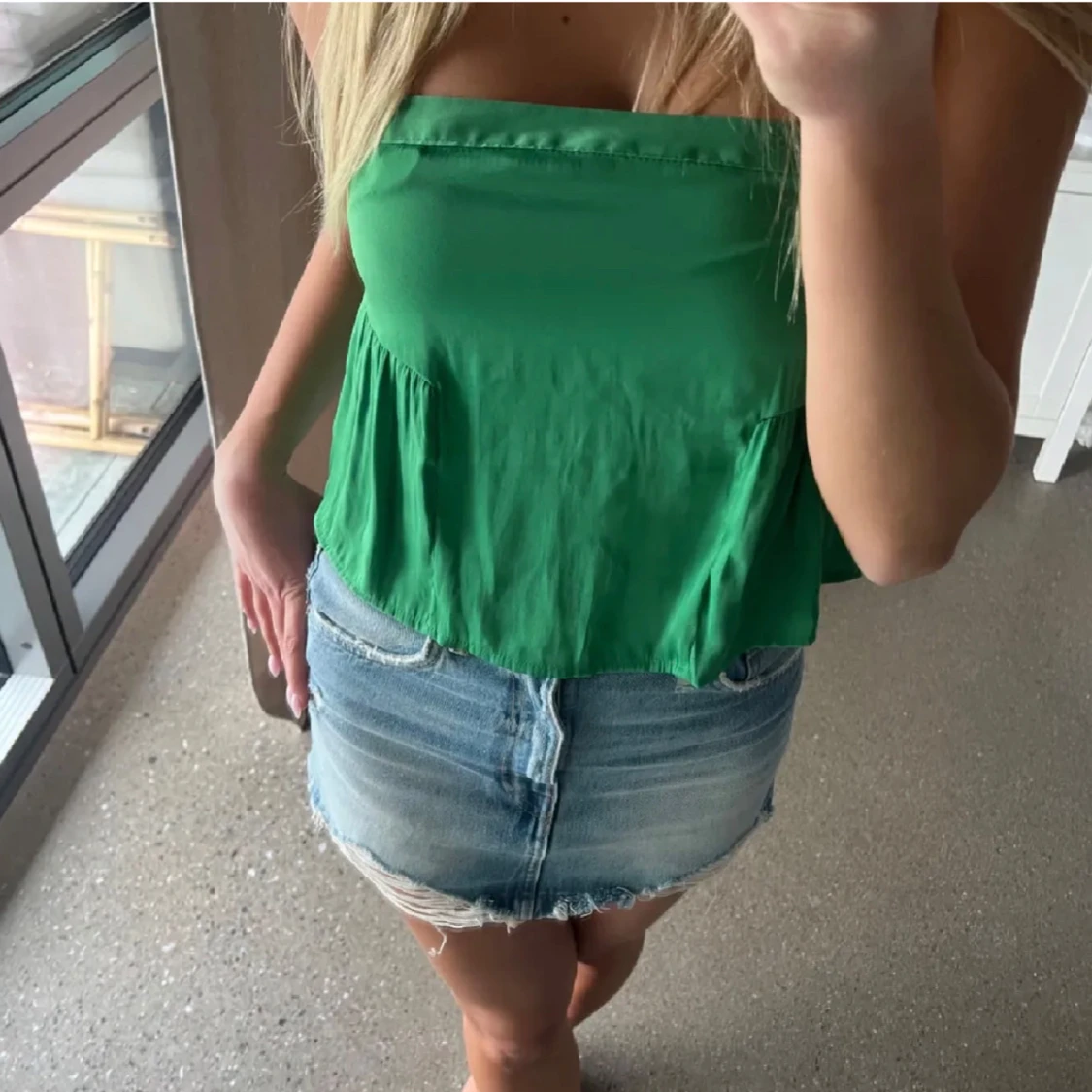 Snygg grön axelbandslös topp med volangdetaljer. Perfekt för sommardagar och festliga tillfällen. Toppen har en luftig passform och tunna axelband för extra stöd.