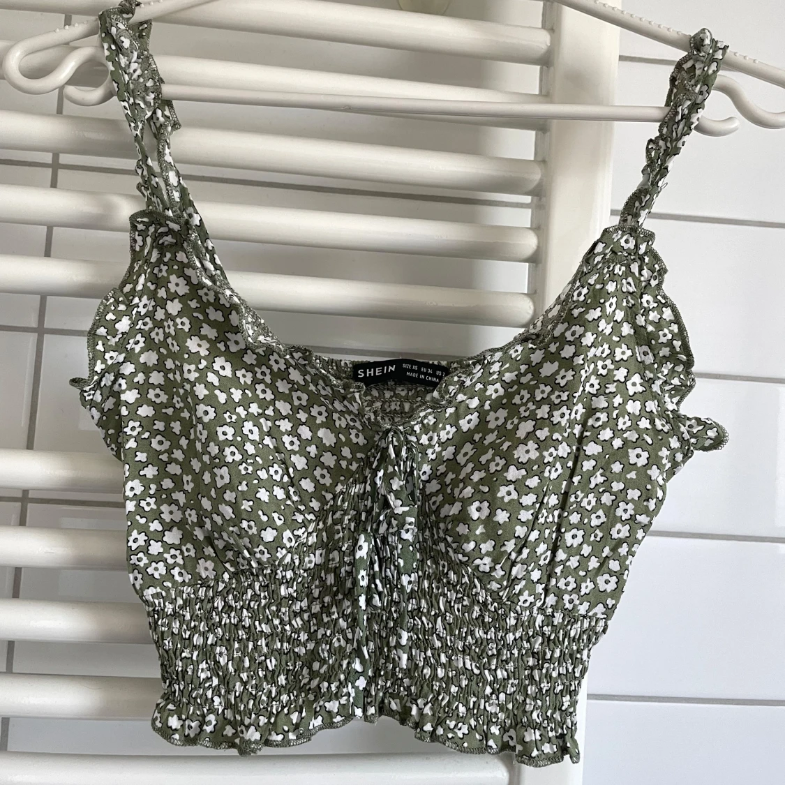 Supersöt grön croppad topp med vitt blommönster, smockad midja och volangdetaljer. Axelbandsmodell med knyt framtill och rynkade axelband.