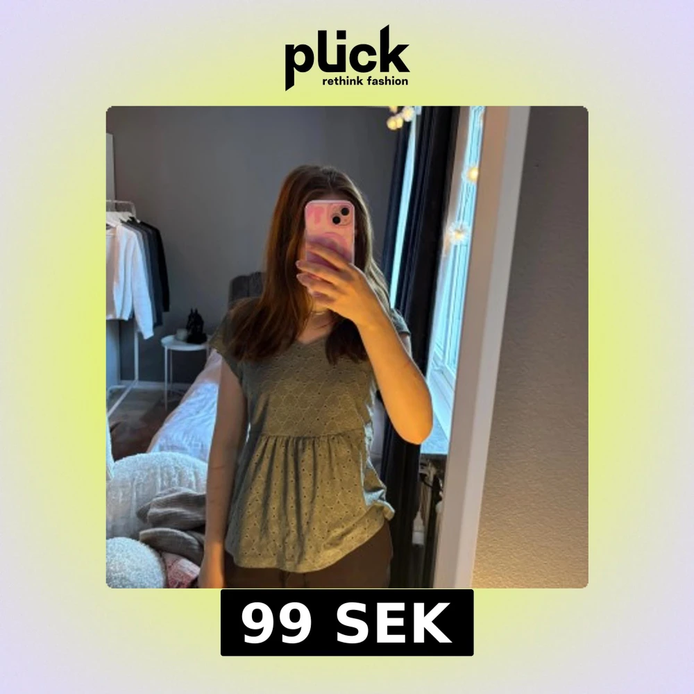 Säljer en söt grön blus med broderade hålmönster och v-ringad hals. Blusen har korta ärmar och en lätt rynkad midja 💘