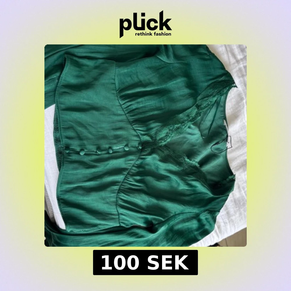 Snygg grön blus med v-ringning och spetsdetaljer längs halsringningen, även smocka i ryggen.💚