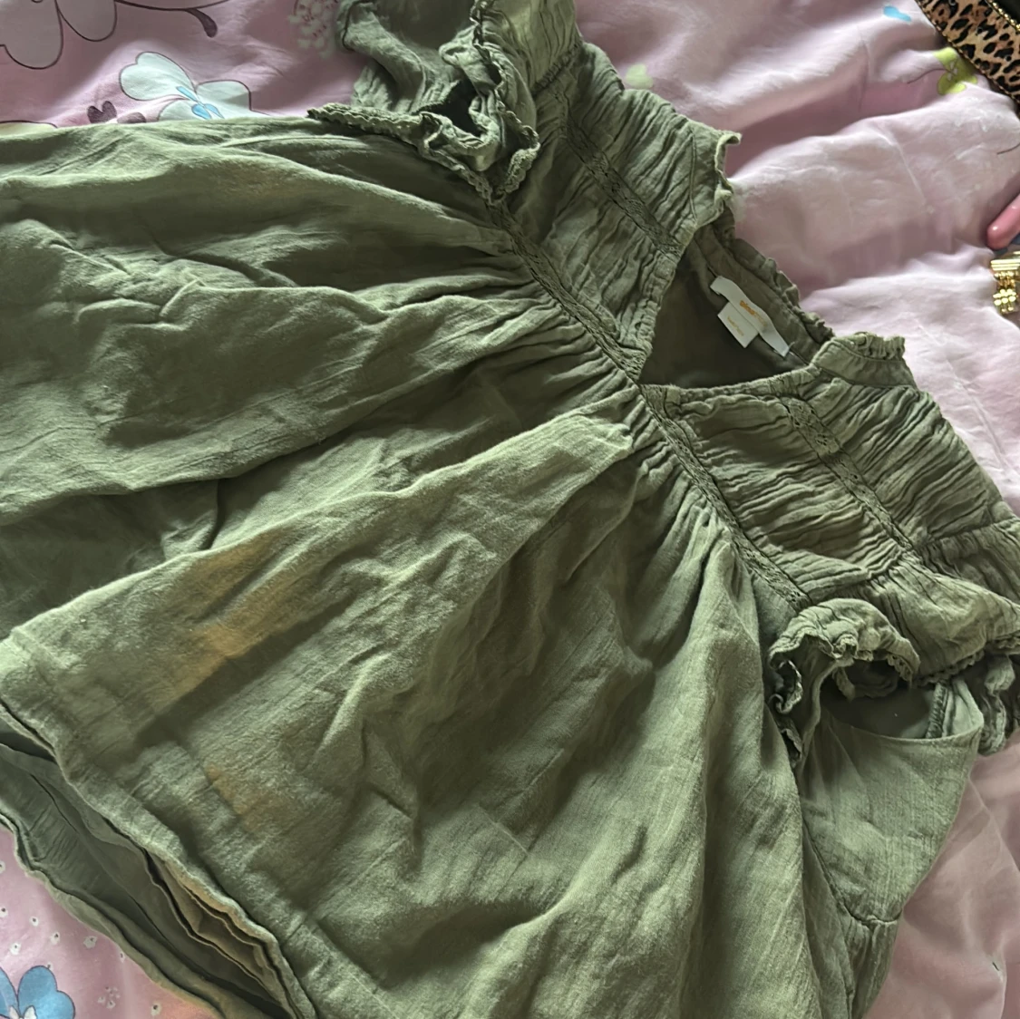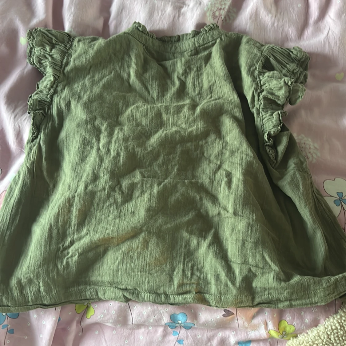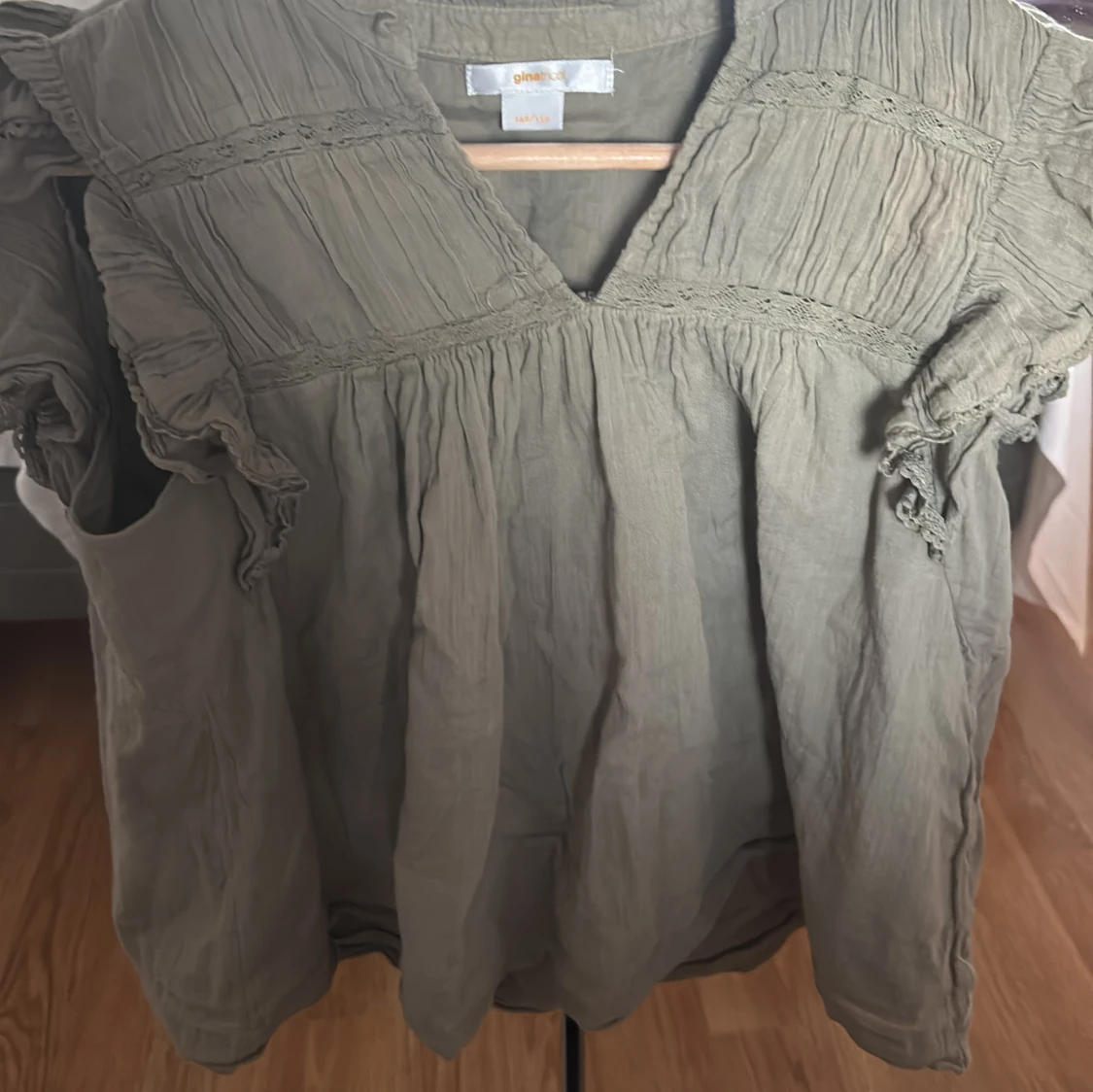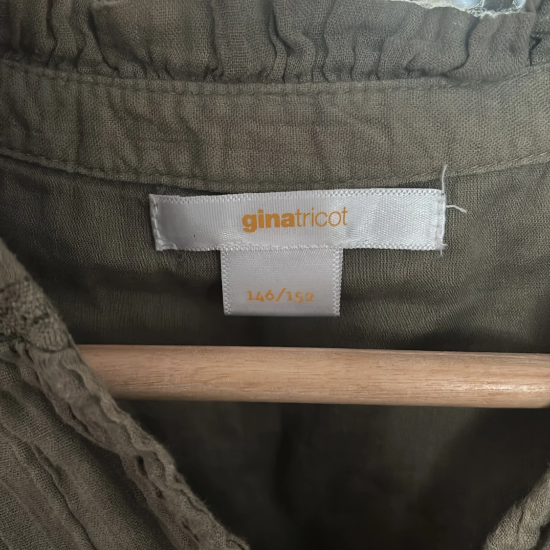 Supersöt grön blus från Gina Tricot med v-ringning och volangdetaljer på ärmarna. Blusen är luftig och har rynkade partier upptill samt korta ärmar med volang. Perfekt för dig som gillar en avslappnad men ändå trendig look.