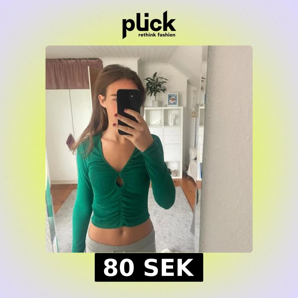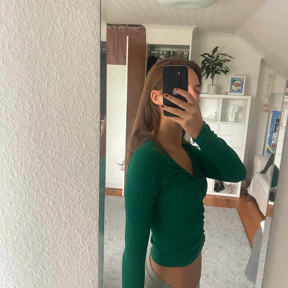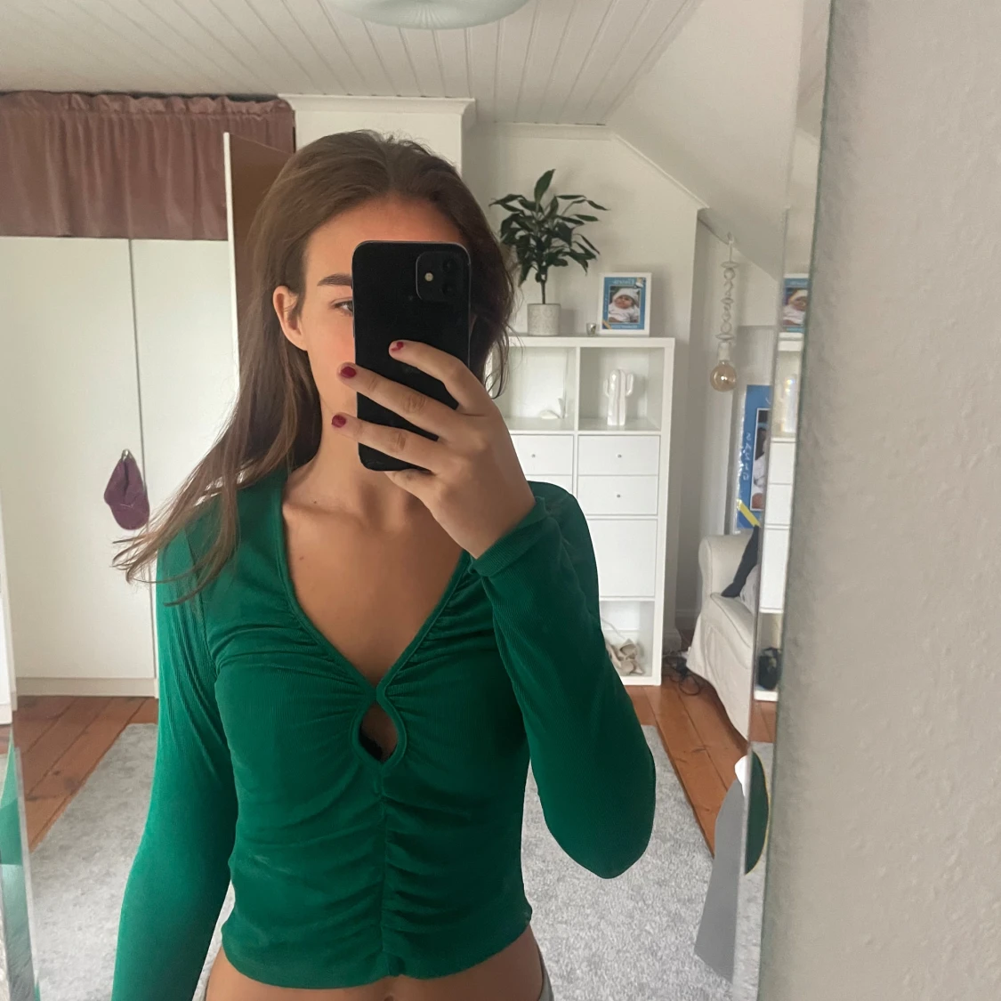 Säljer en grön croppad topp med lång ärm och snygg v-ringning. Toppen har ett coolt rynkat parti framtill med en liten slits och håldetalj vid bröstet. Materialet är mjukt och stretchigt, perfekt för dig som gillar trendiga och bekväma plagg.