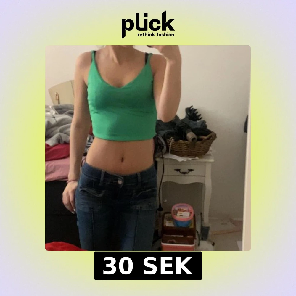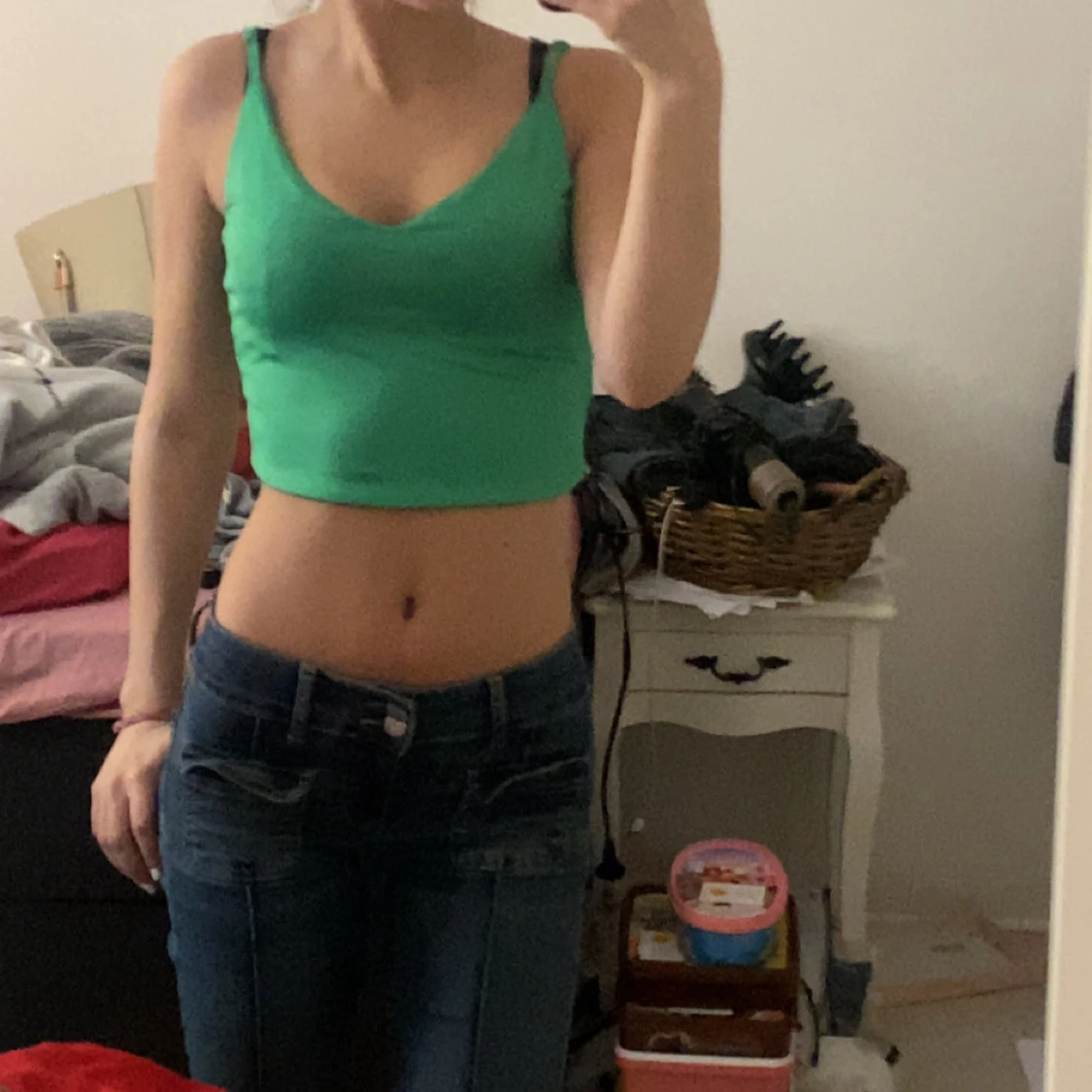 Säljer en grön croppad linnetopp med smala axelband. Toppen har en tight passform och är perfekt för varma dagar. Enkel och stilren design som passar till mycket.