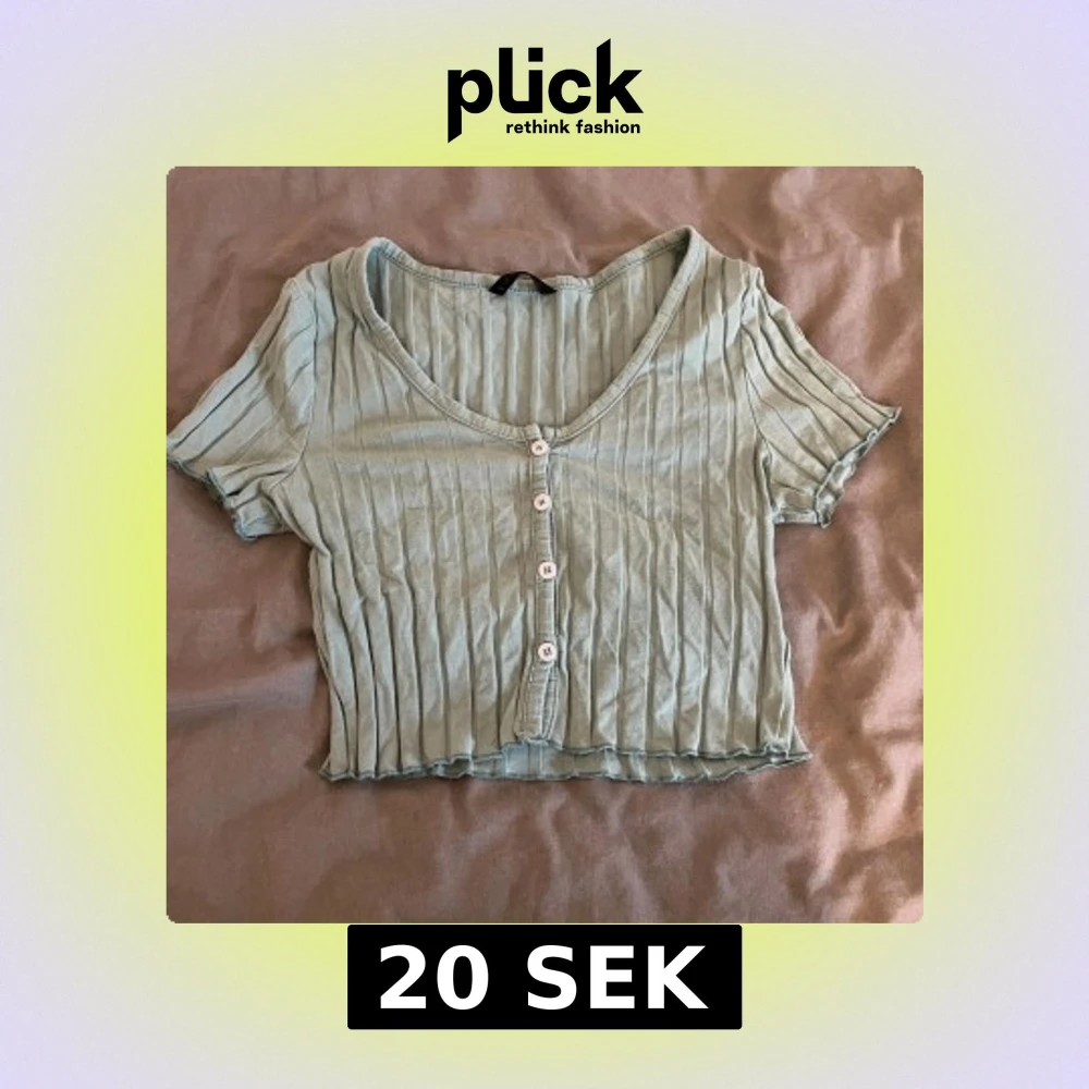 Säljer en grön croppad topp med korta ärmar och knappar framtill. Perfekt för en avslappnad stil.