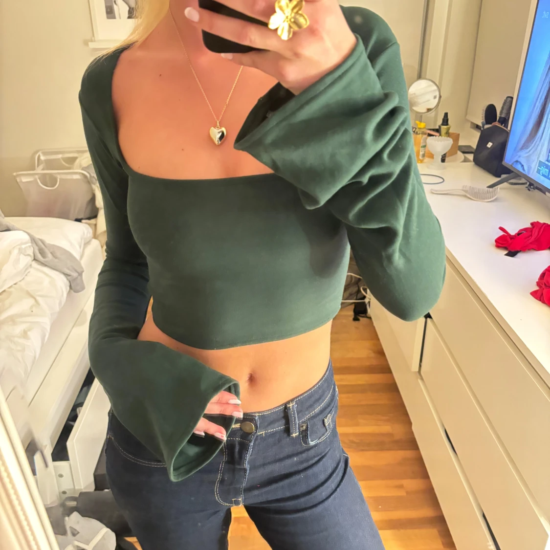 Snygg grön croppad topp med långa ärmar och en fyrkantig halsringning. Perfekt för en trendig look.