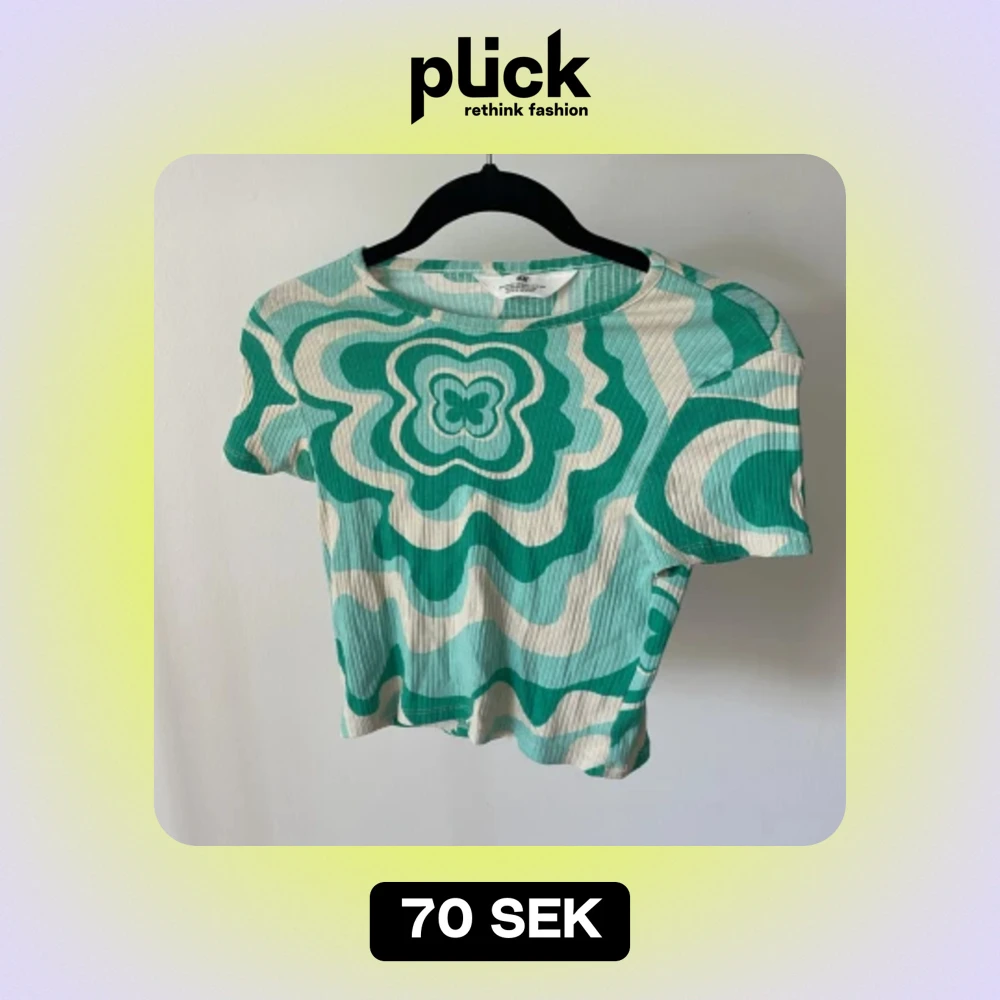 Säljer en superfin topp från H&M i storlek XS. Den är grön och vit med ett coolt, vågigt mönster och en stor fjäril i mitten. Toppen är ribbad och har korta ärmar. Perfekt för sommaren och vårens alla äventyr! 🌸