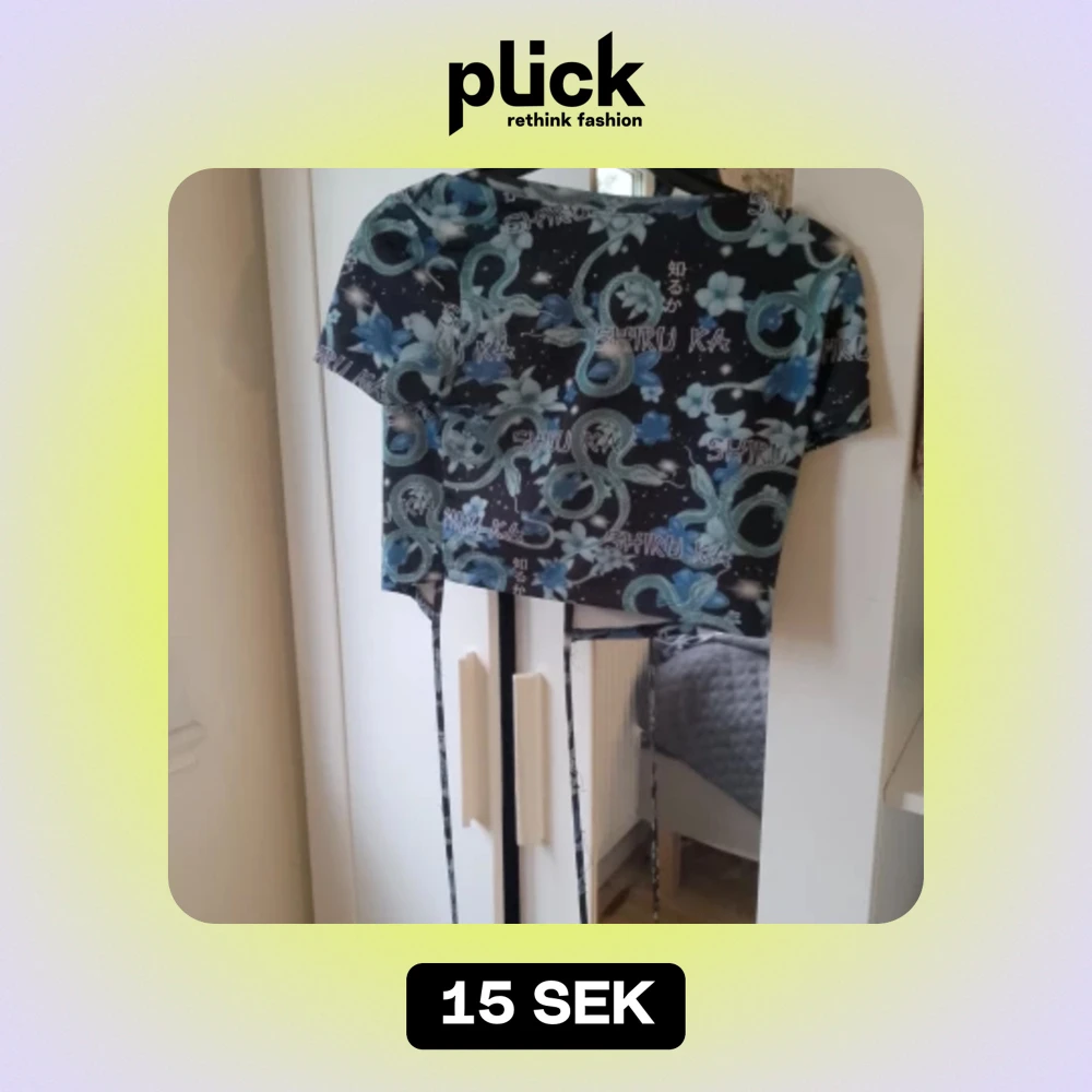 Säljer en cool kortärmad topp med ett unikt mönster av drakar och blommor i blått och grönt på en svart bakgrund. Toppen har en öppen rygg med knytband som ger en snygg detalj. Perfekt för en festlig kväll eller en dag när du vill sticka ut! har dok två små hål men dom syns inte